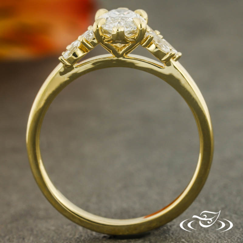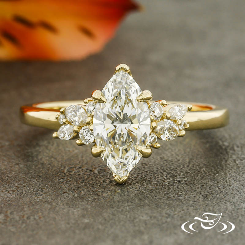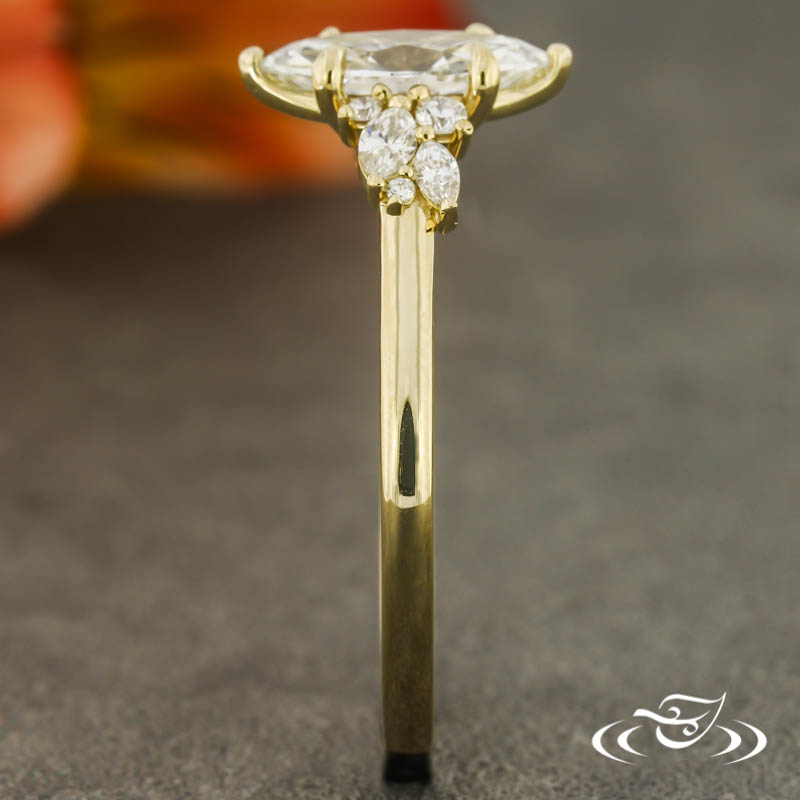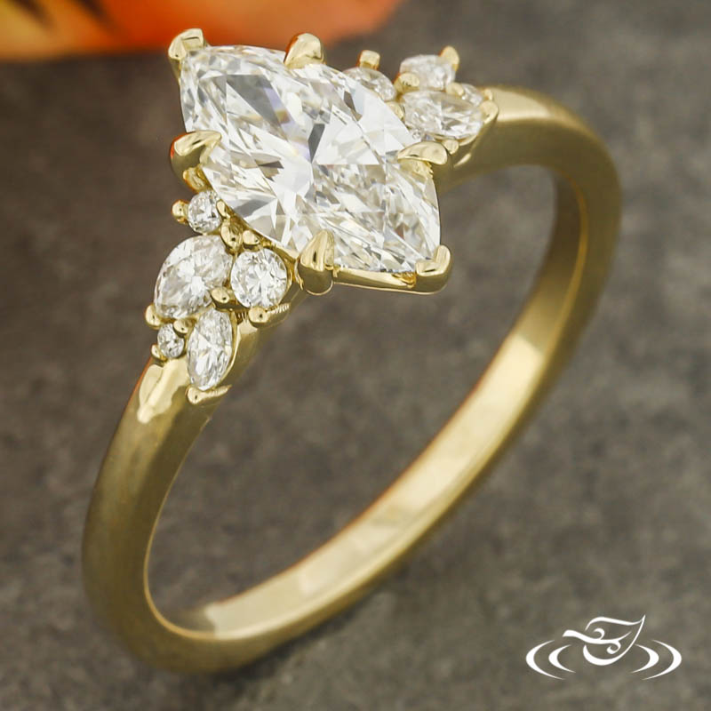 Custom 14kt yellow gold ring holding (1) GLJW provided marquise cut lab diamond center stone prong set with (2) chevron prongs on the pointed ends and (4) delicate pointed prongs on the sides. Each shoulder is accented by a cluster of (3) round and (2) marquise cut lab diamond melee. This ring has a round domed profile and a high polish finish.