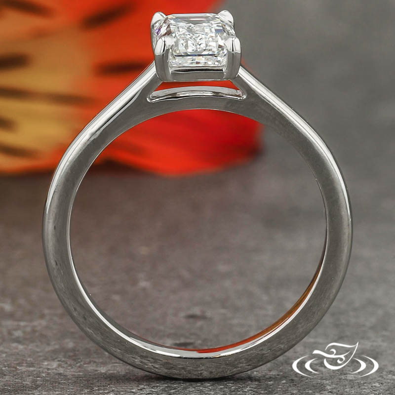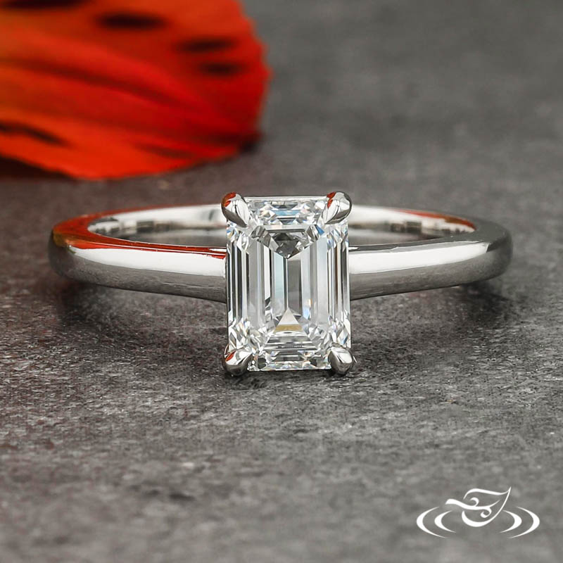 Custom 950 platinum solitaire ring holding a 4-prong set GLJW provided emerald cut lab diamond center stone. This ring also has a round shank, slightly domed profile, and a high polish finish.