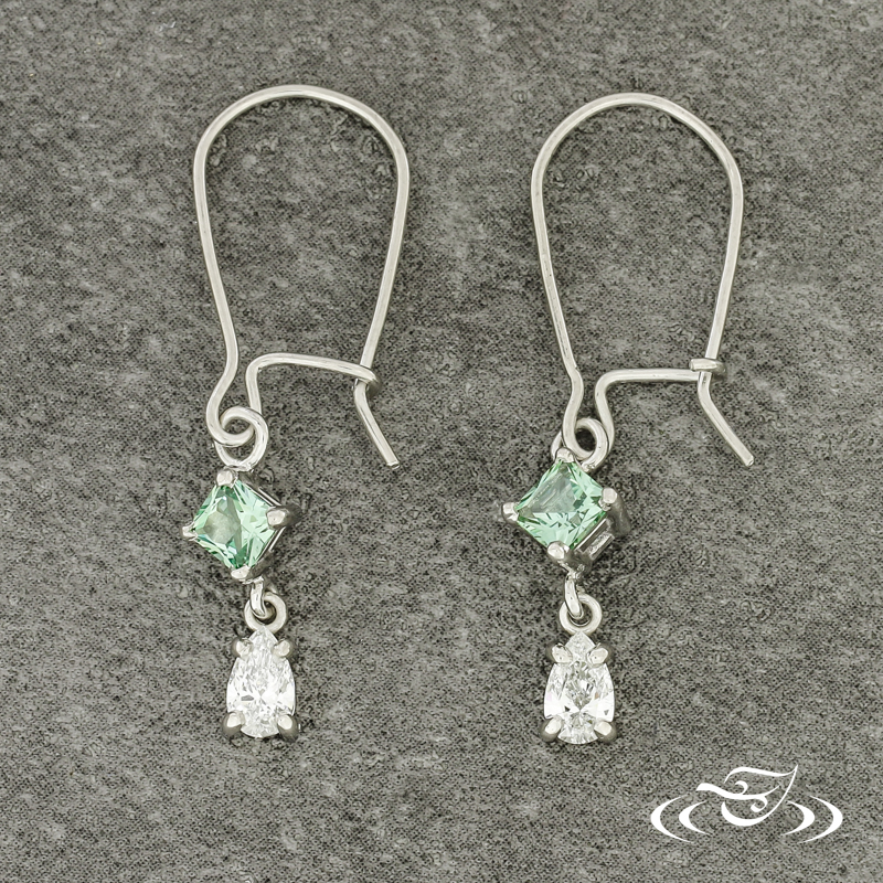 (2) Custom 950 platinum dangle earrings each holding (1) GLJW provided princess cut green lab sapphire and (1) GLJW provided pear cut lab diamond each prong set in a dangle style all with a high polish finish.