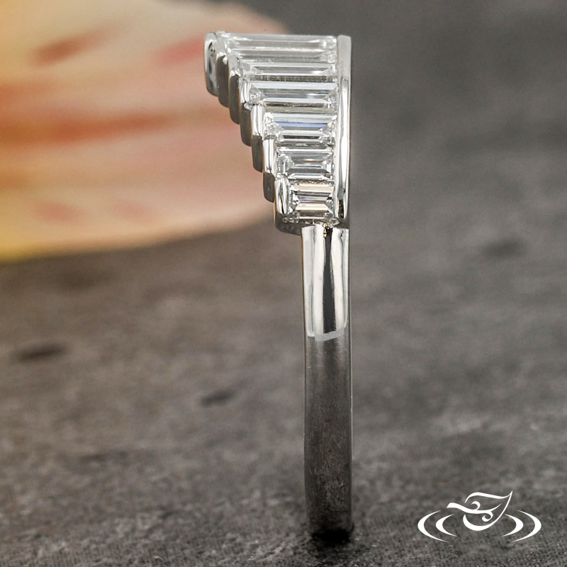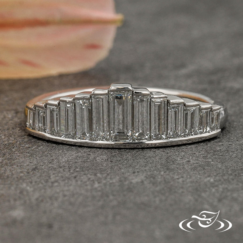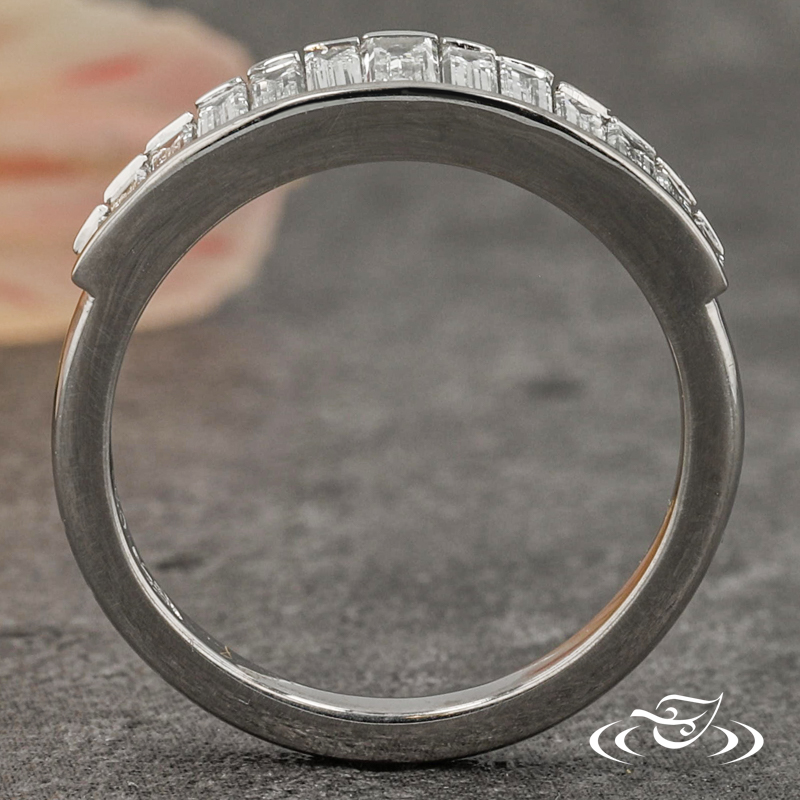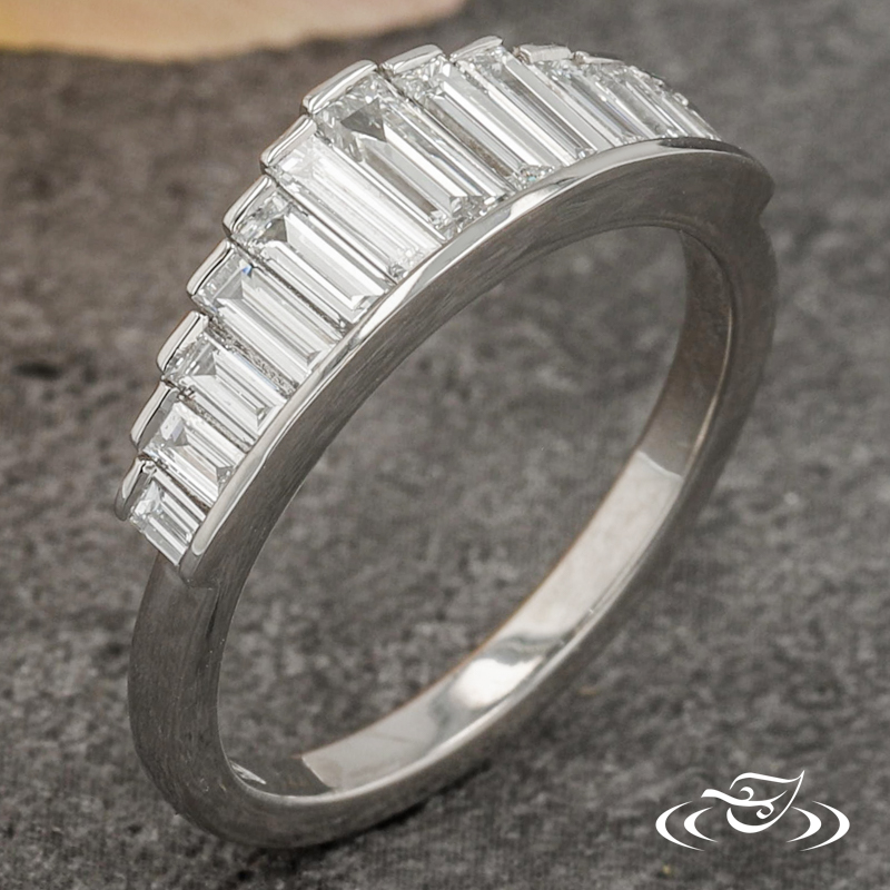 Custom 950 platinum band with a total of (13) GLJW provided baguette cut lab diamond melee channel set vertically in a row along the top ~third. The stones taper in size with the largest stone in the center. The remainder of the band has a round domed shank. All with a high polish finish.