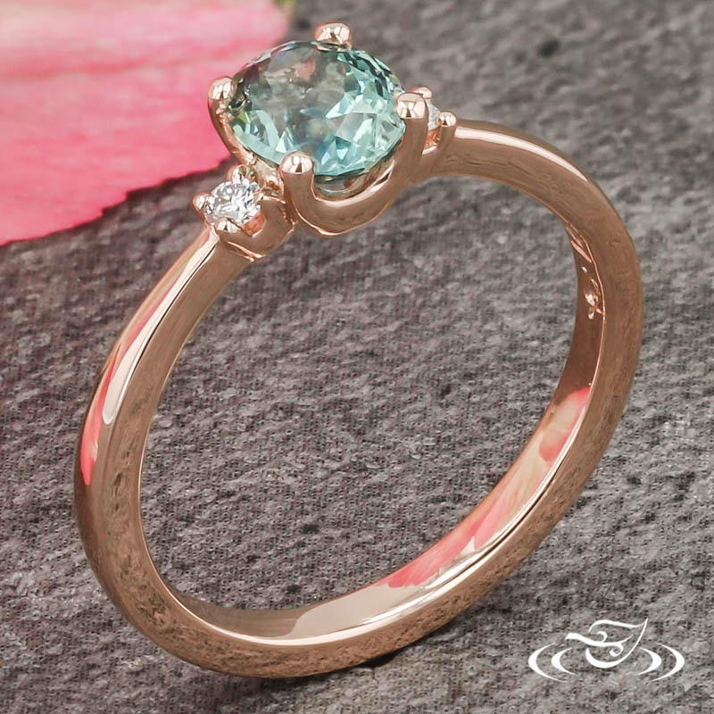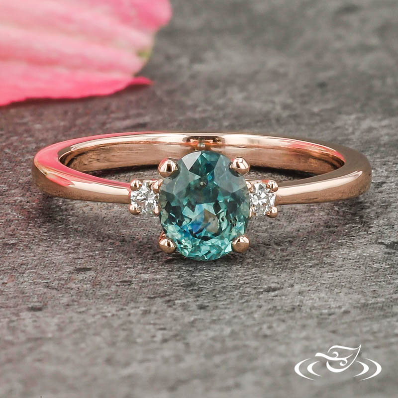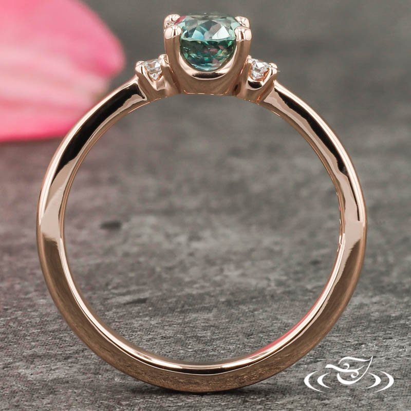 Custom 14kt rose gold three stone ring holding a 4-prong set GLJW provided oval sapphire center stone flanked by (1) GLJW provided round diamond prong set on either shoulder. This ring also has a round reverse taper shank and a high polish finish.