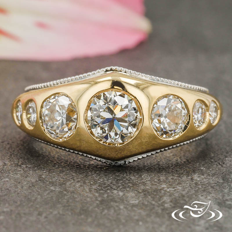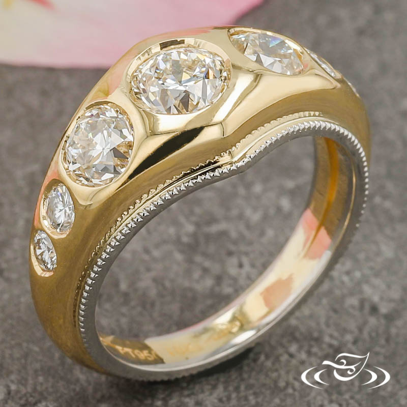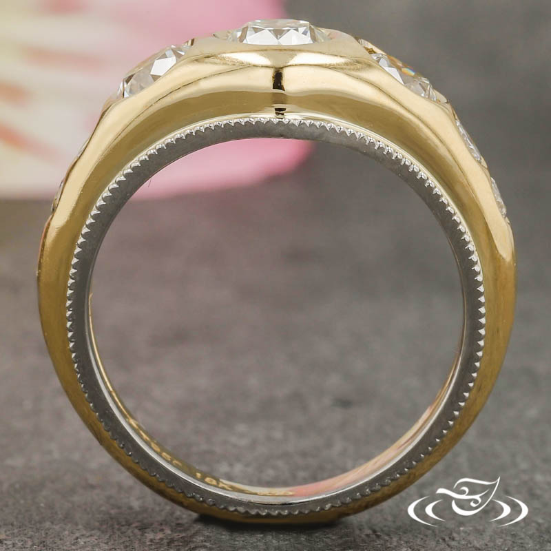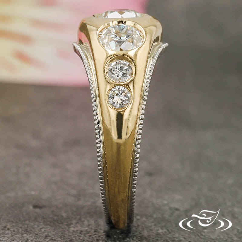 Custom 2 tone platinum and gold ring holding a flush set customer provided round diamond center stone. (5) customer provided round diamond stones flush set on top face. This ring also has a round curve taper shank and a high polish finish with platinum millgrain rails.