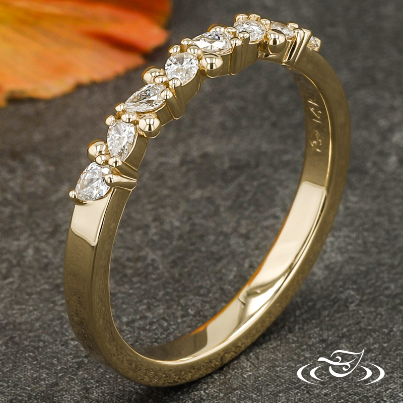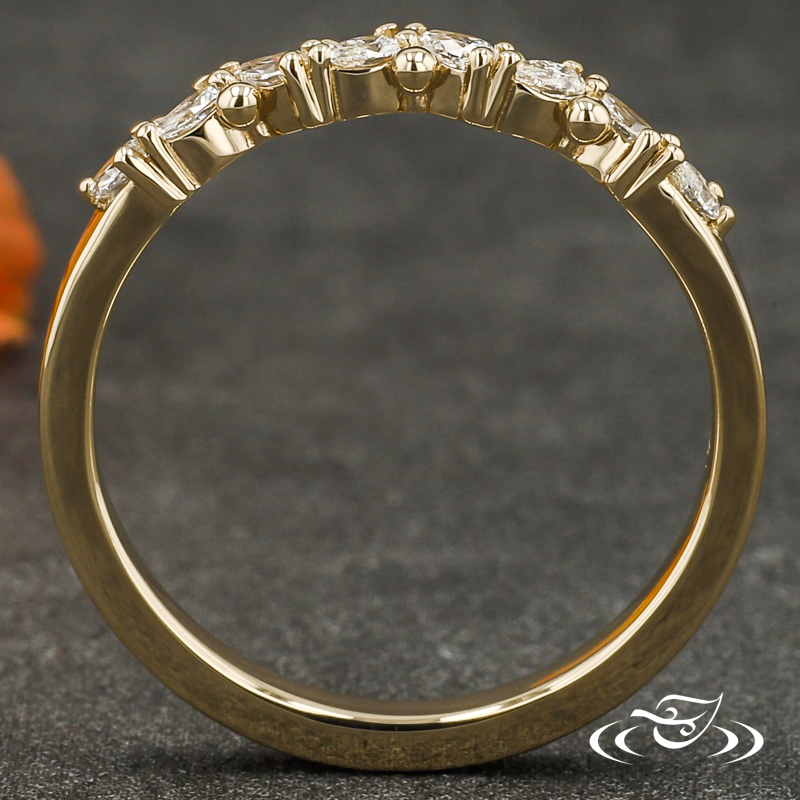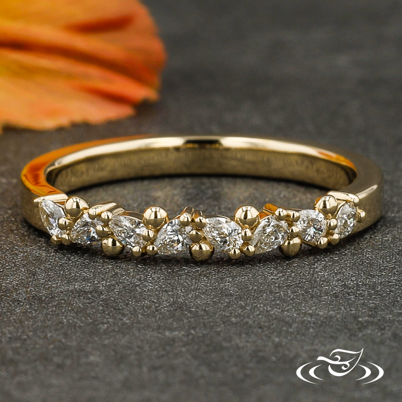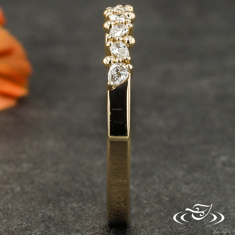 Custom 14k yellow gold band featuring pear diamonds prong set on top face. This band also has a round shank, slightly domed profile, and high polish finish.