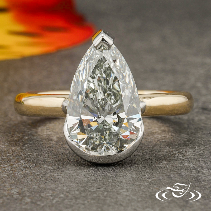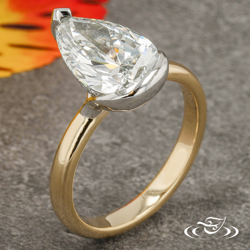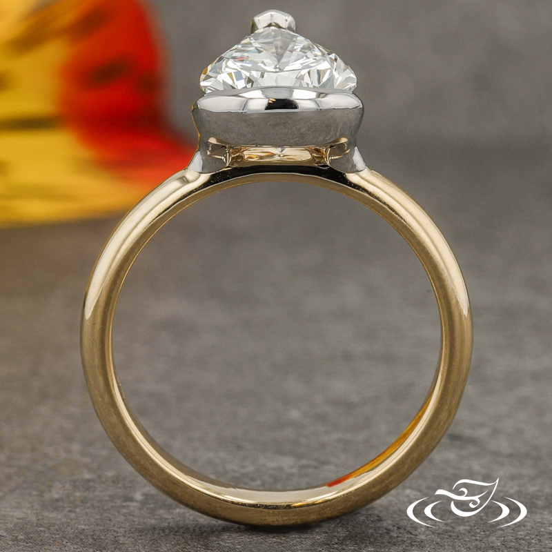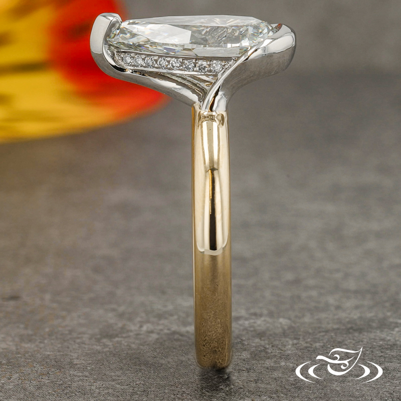 Custom 2-tone ring featuring (1) GLJW provided pear lab diamond center stone set with chevron prong at tip and half-bezel at bottom in platinum with hidden halo of GLJW provided round lab diamond melee bead set. This ring also has a 14k yellow gold round shank with slightly domed profile and a high polish finish.