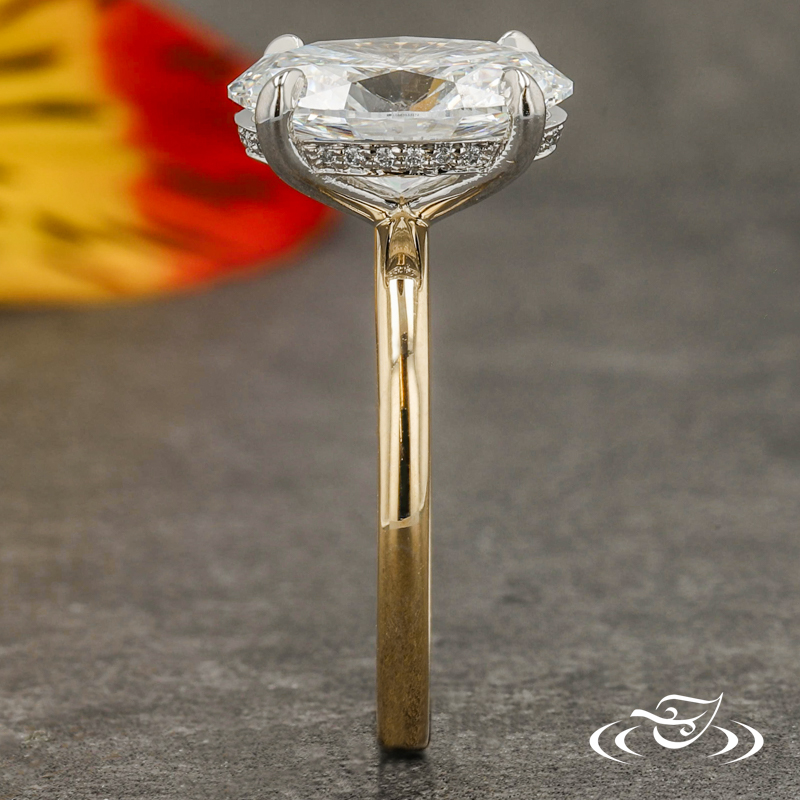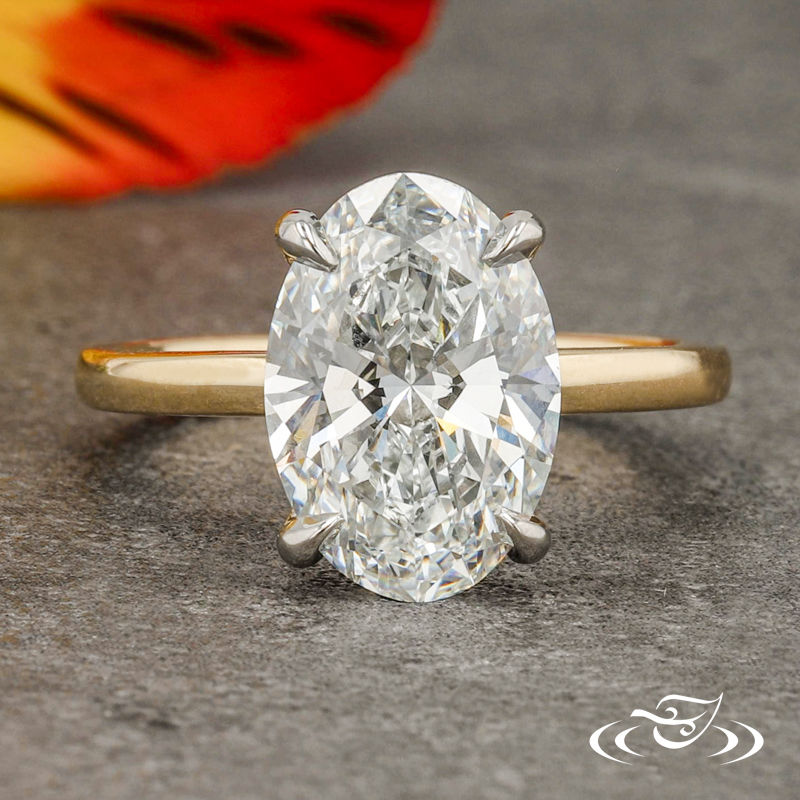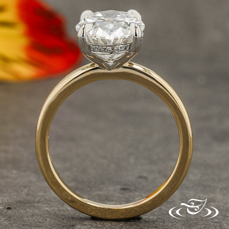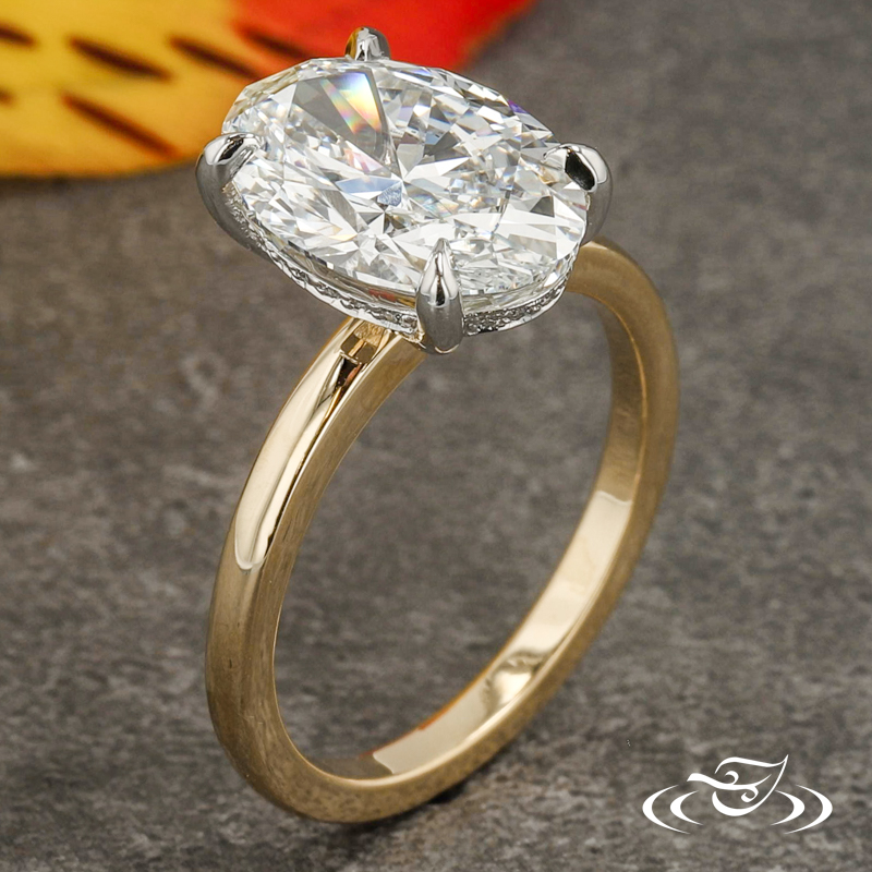 Custom two-tone ring with a 950 platinum center setting holding (1) 4-prong set GLJW provided oval cut lab diamond center stone. The center stone is surrounded by a bead set hidden halo of GLJW provided round cut lab diamond melee. The remainder of the ring is comprised of a 14k yellow gold round shank. All with a high polish finish.