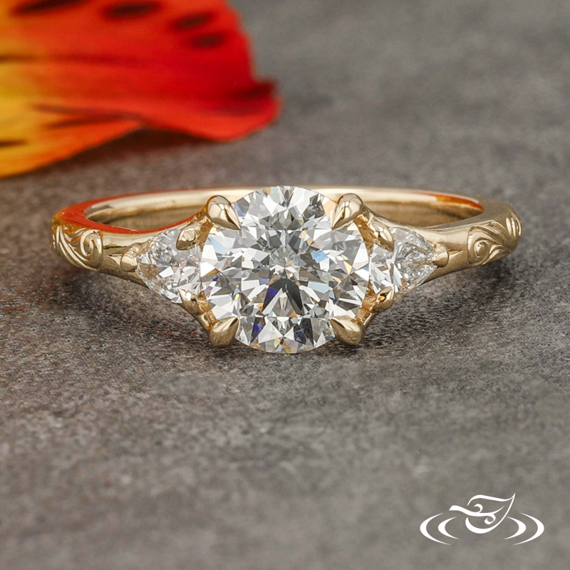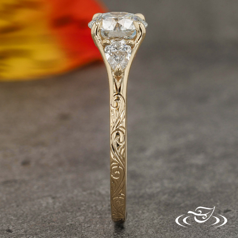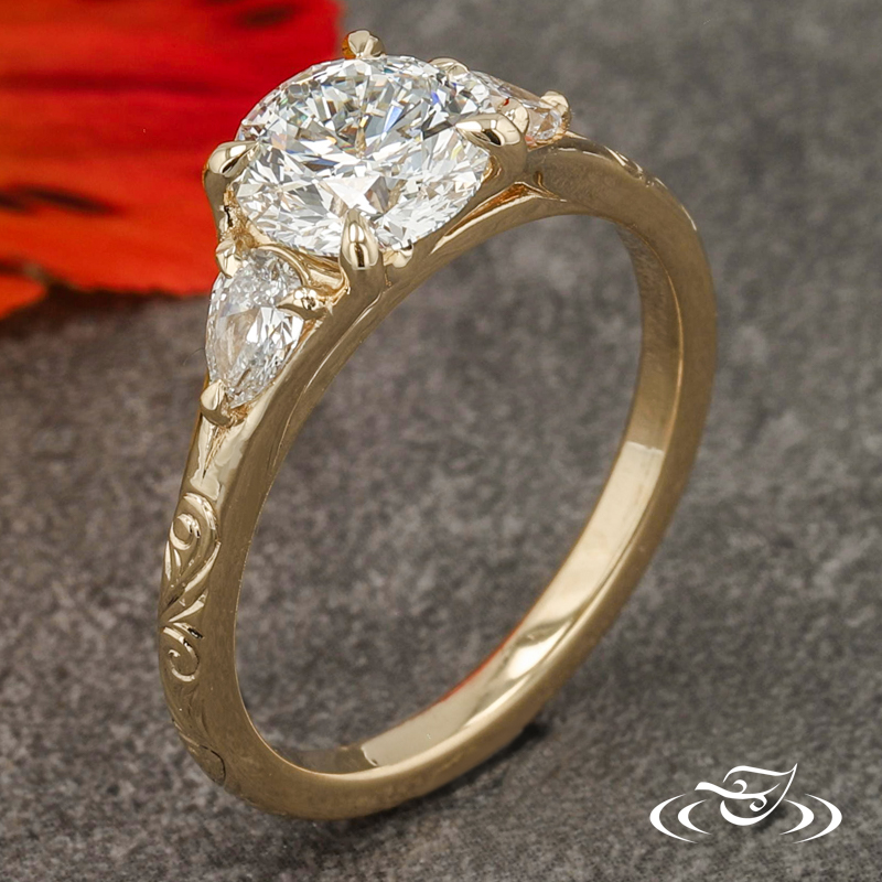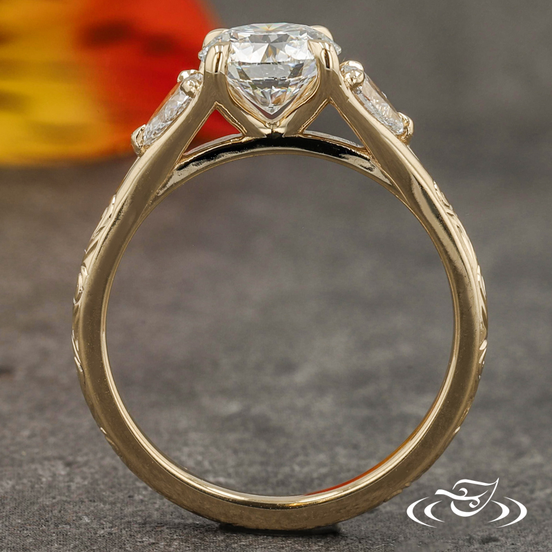 Custom 14kt yellow gold 3-stone ring holding a 4-prong set GLJW provided round lab diamond center stone flanked by (2) 4-prong set GLJW provided pear lab diamonds set in the opening of a split shank. Hand engraved with a scroll pattern on the top face, eternity style. This ring also has a round shank and a high polish finish.