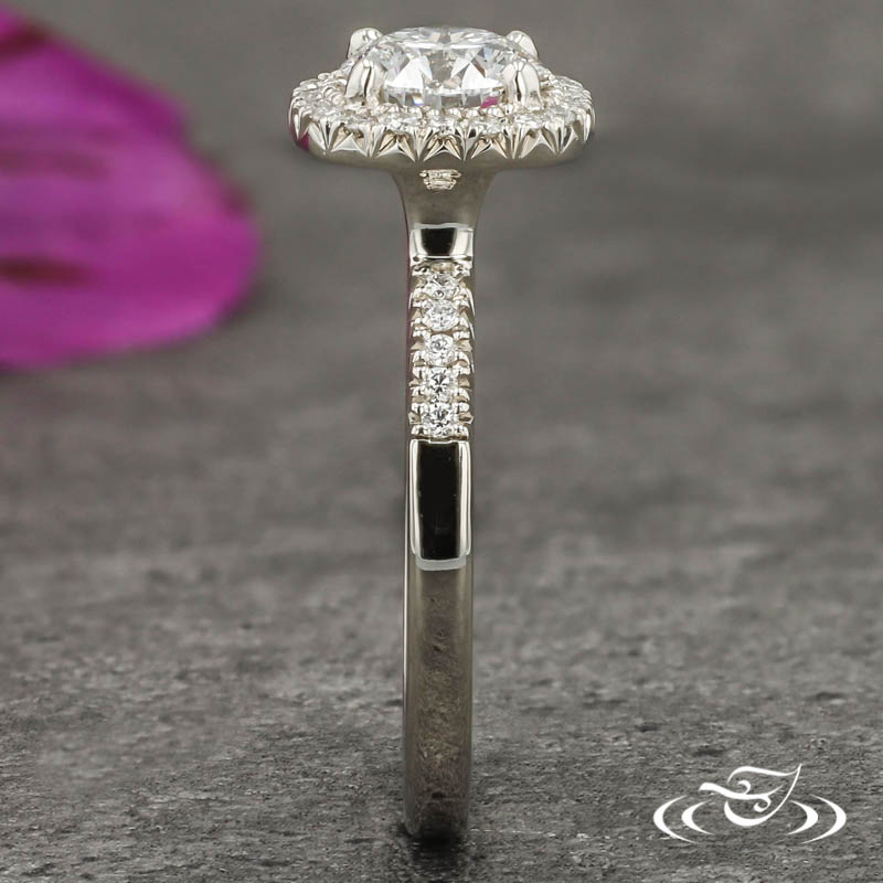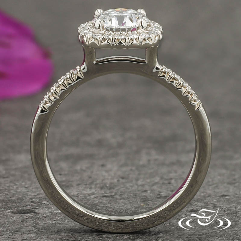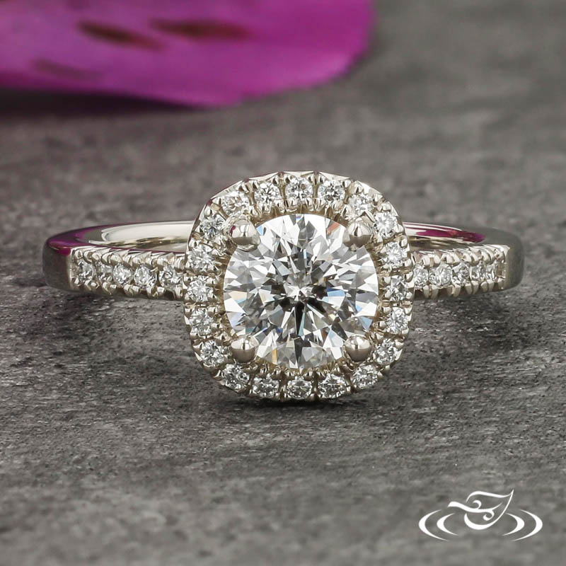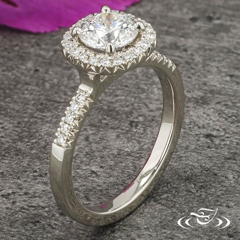 Custom 14kt white gold ring featuring (1) 4-prong set GLJW provided round lab diamond center stone surrounded by halo of GLJW provided round lab diamond melee french set. Each shoulder features (5) additional GLJW provided round lab diamond melee french set. This ring also has a round shank, slightly domed profile, and a high polish finish.