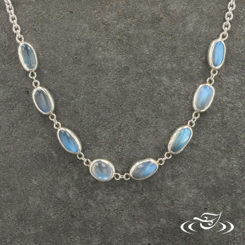Custom sterling silver necklace fabricated using customer's existing (8) bezel set oval cabochon cut moonstones. Each bezel is attached to one another with (3) jump rings, with the bezels lengthwise from east to west. The strand of bezels are attached to a 16" long and 3.1mm wide sterling silver cable chain. Each bezel was cleaned and parts removed. This entire necklace is finished in a high polish.