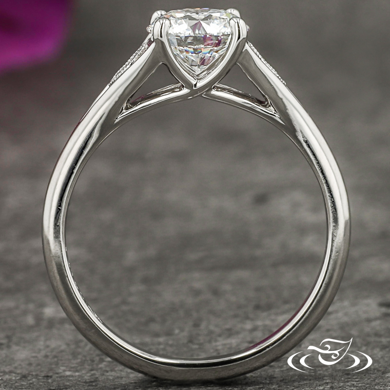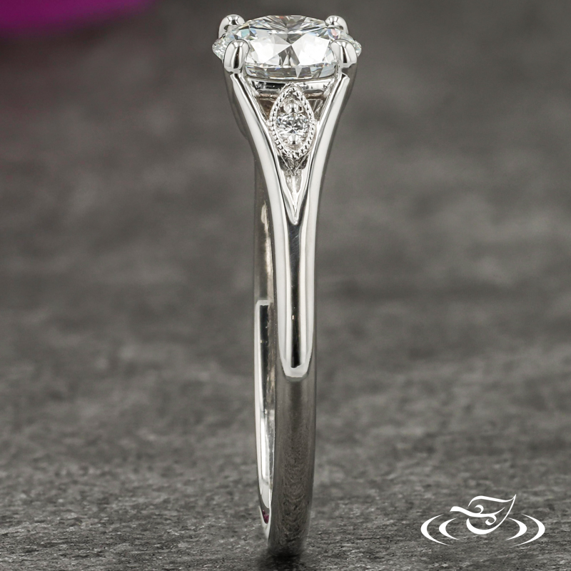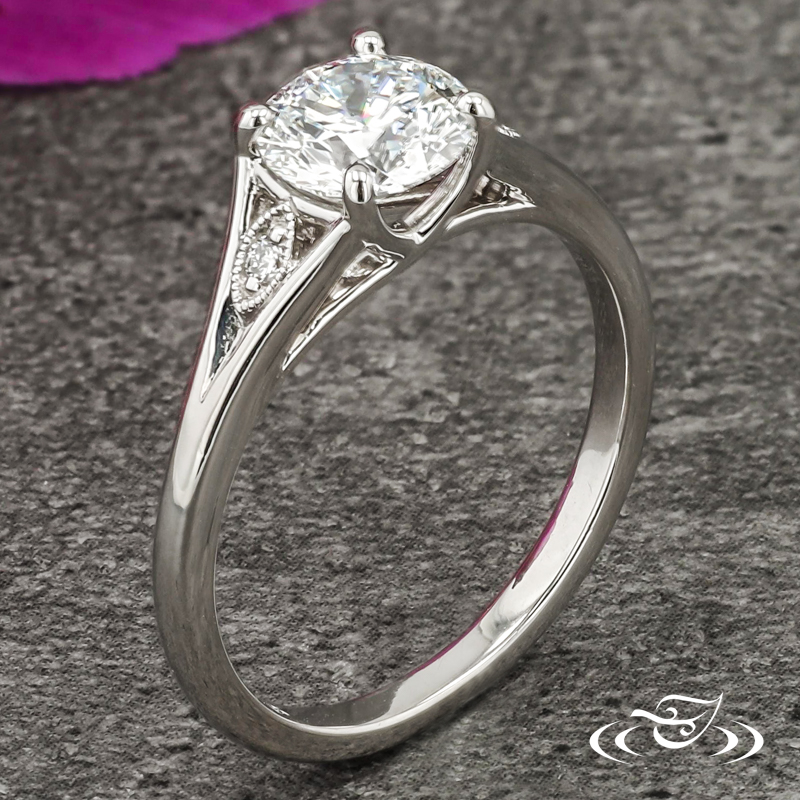 Custom 950 platinum ring featuring (1) 4-prong set GLJW provided round lab diamond center stone in trellis style setting. Split, curve-tapered shoulder feature pierced area with (1) GLJW provided round lab diamond melee bead set in marquise shaped motif with fine milgrain detailing. All with high polish finish.