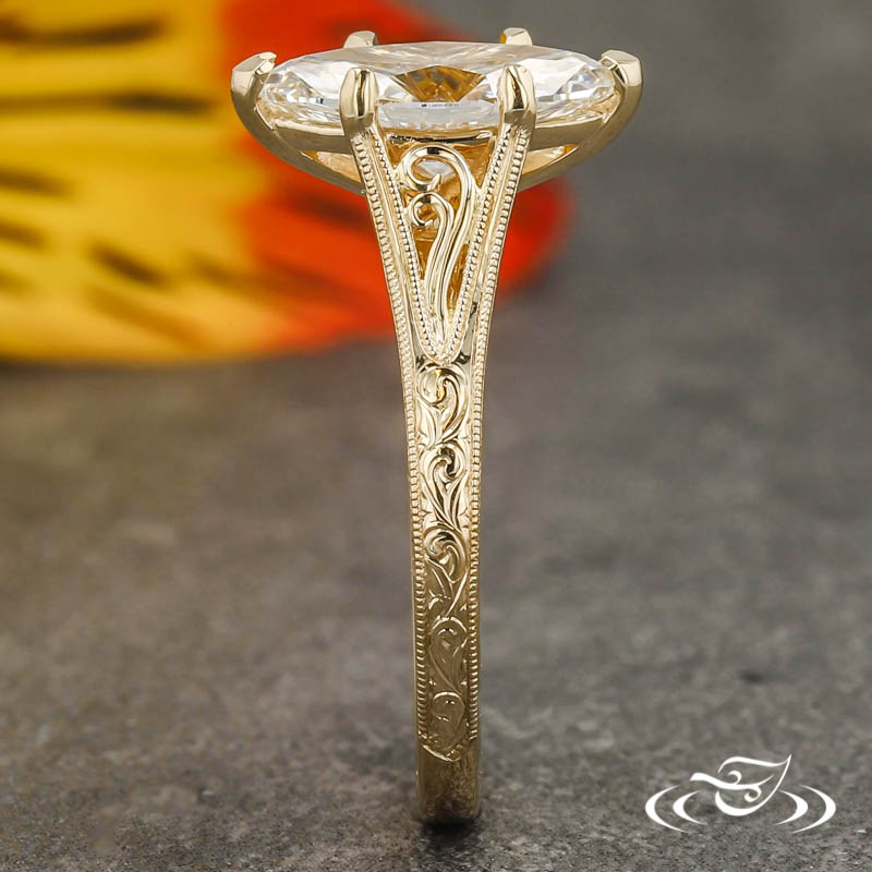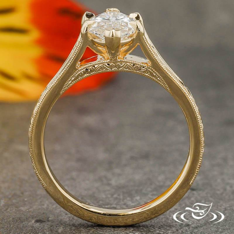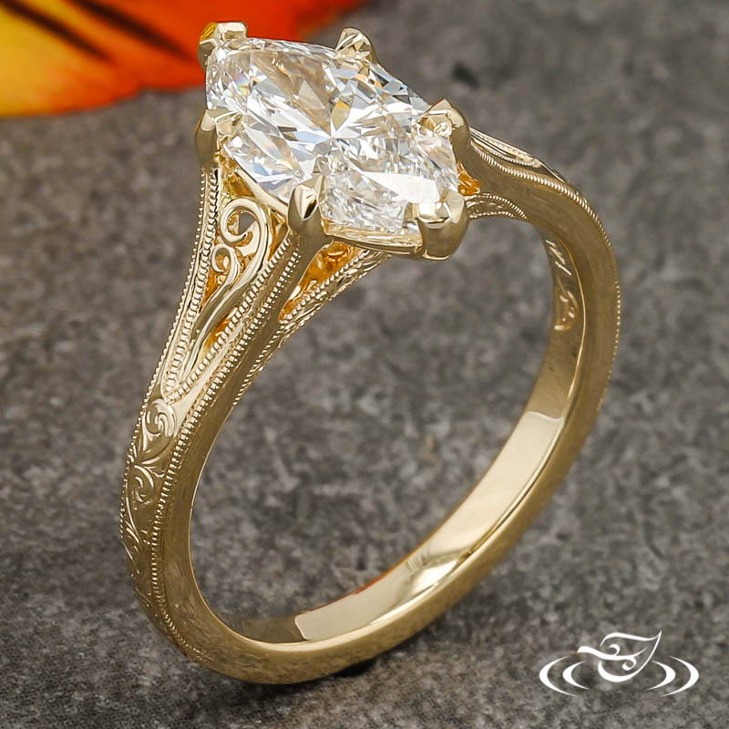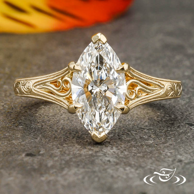 Custom 14kt yellow gold ring holding (1) GLJW provided marquise cut lab diamond center stone 6-prong set with (2) chevron shaped prongs on the pointed ends and (4) delicate claw prongs on the sides. The center is flanked by split tapered shoulders which are each accented by (2) hand fabricated filigree curls. This ring has hand engraved scroll patterning along the top three-quarters of the round domed shank and along the bridge on both side faces. The engraving is framed in delicate milgrain detailing. All with a high polish finish.