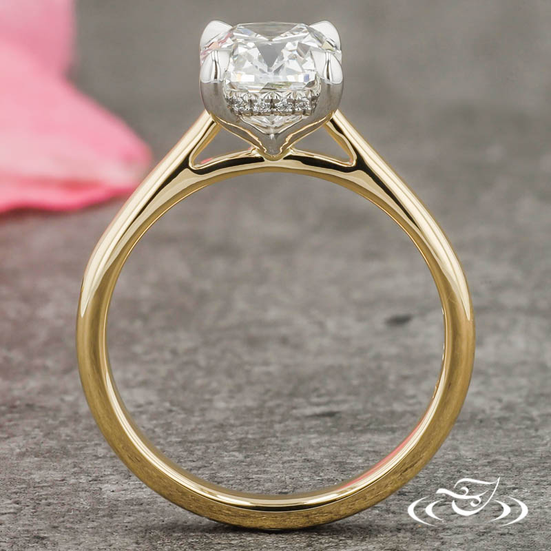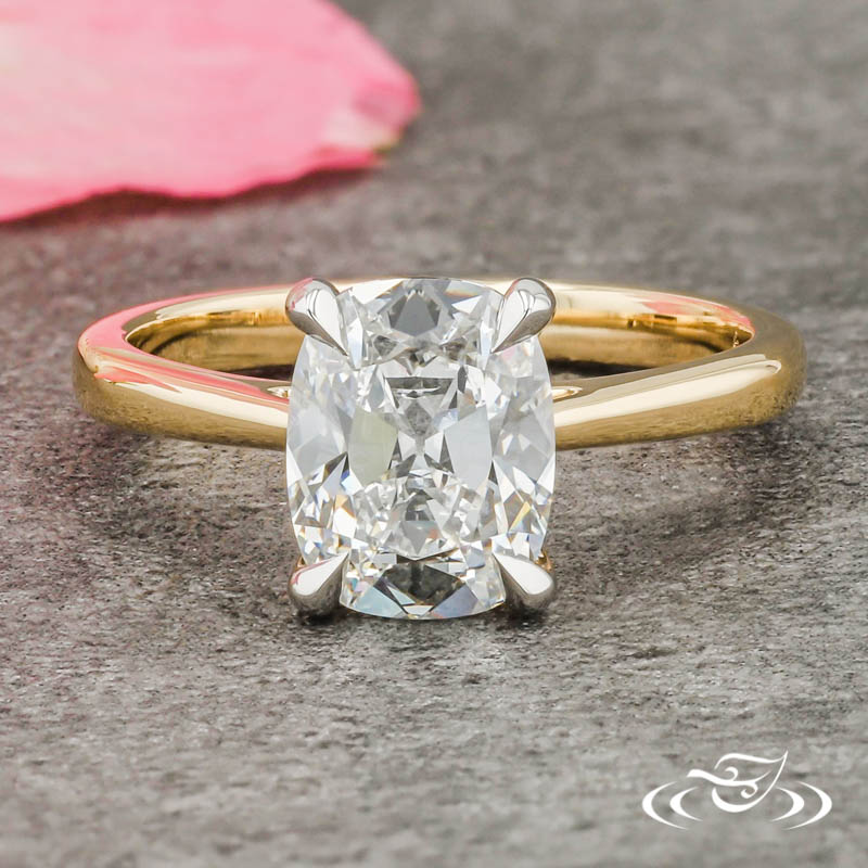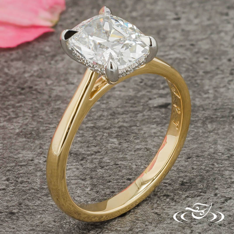 Custom 2-tone ring holding featuring (1) 4-prong set GLJW provided cushion lab diamond center stone in platinum head with hidden halo of (18) GLJW provided round lab diamond melee french set. This ring also has a 14k yellow gold round, reverse taper shank with slightly domed profile, all with high polish finish.