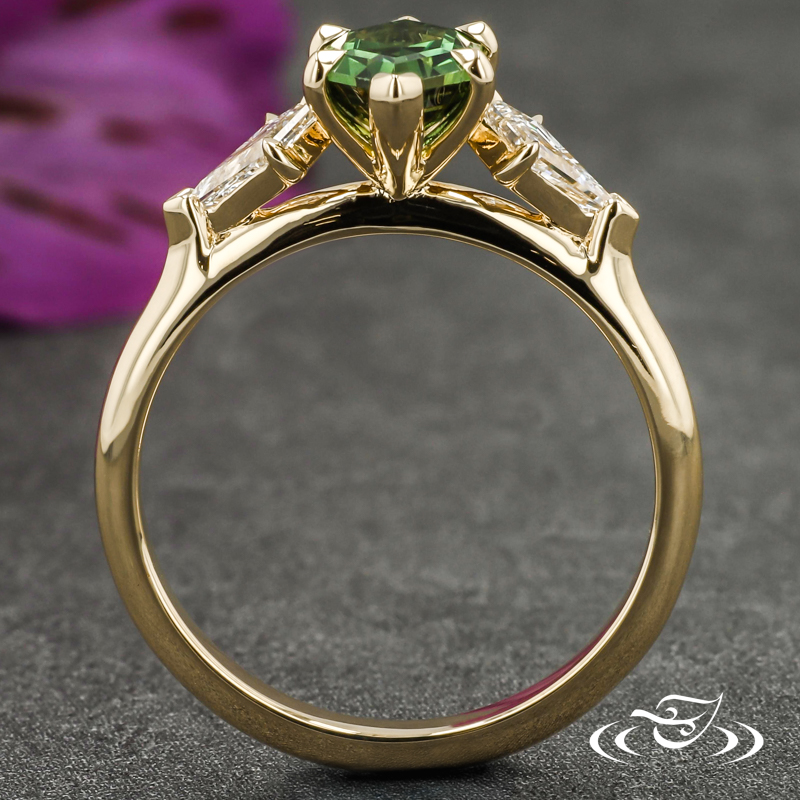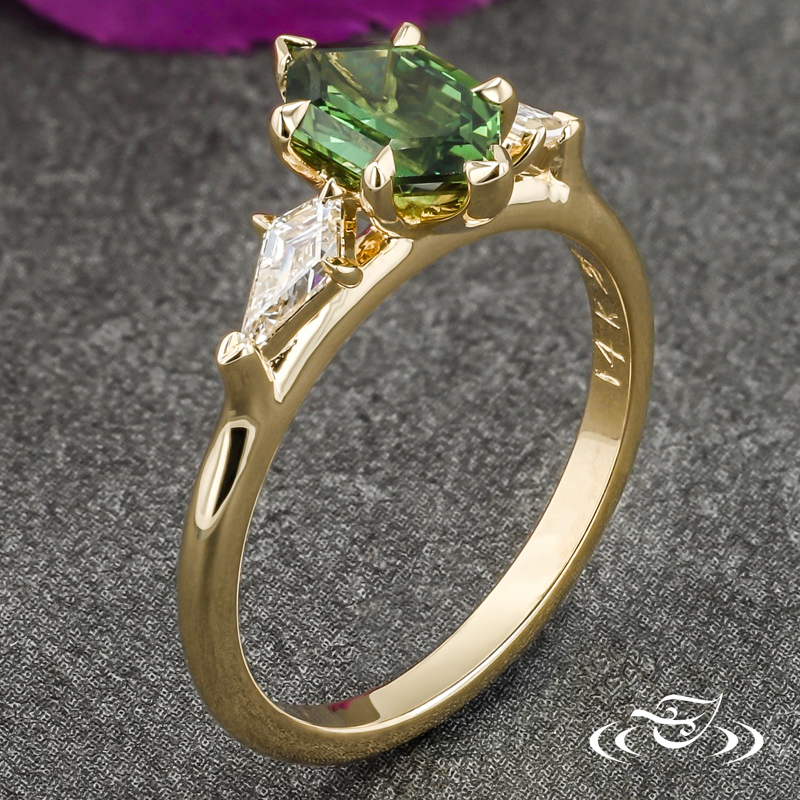 Custom 14kt yellow gold ring featuring (1) GLJW provided hexagon green sapphire flanked by (2) GLJW provided kite lab diamond stones, all with chevron and pointed prongs. This ring also has a round, reverse taper shank, slightly domed profile, and a high polish finish.