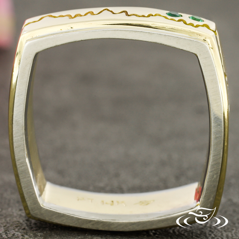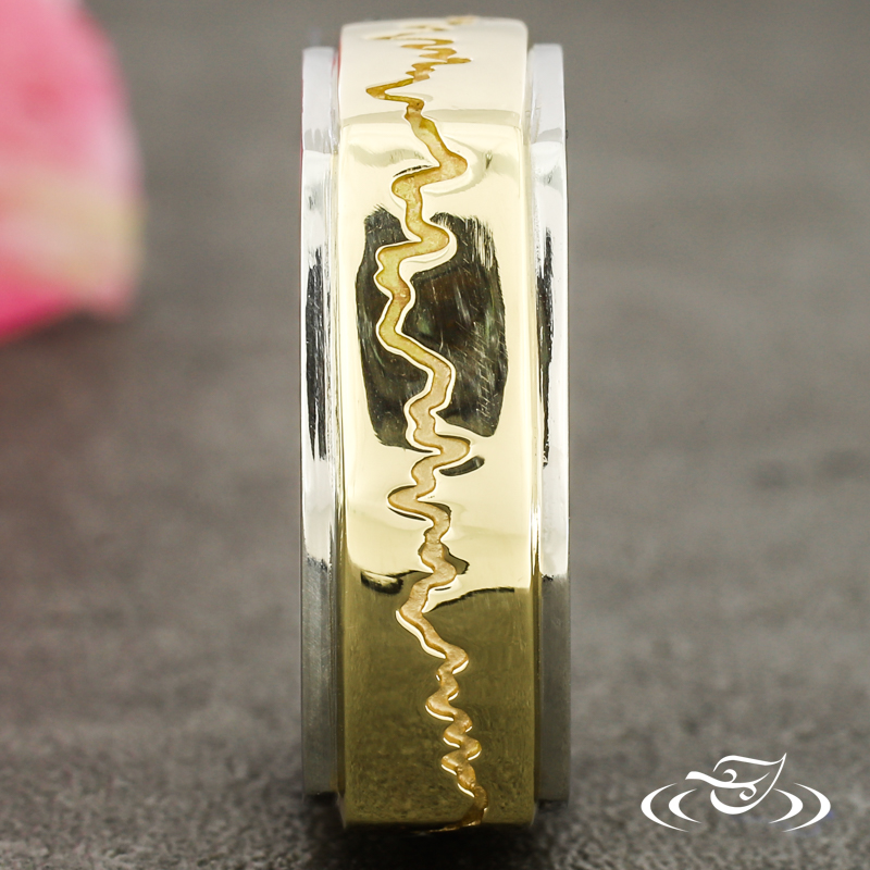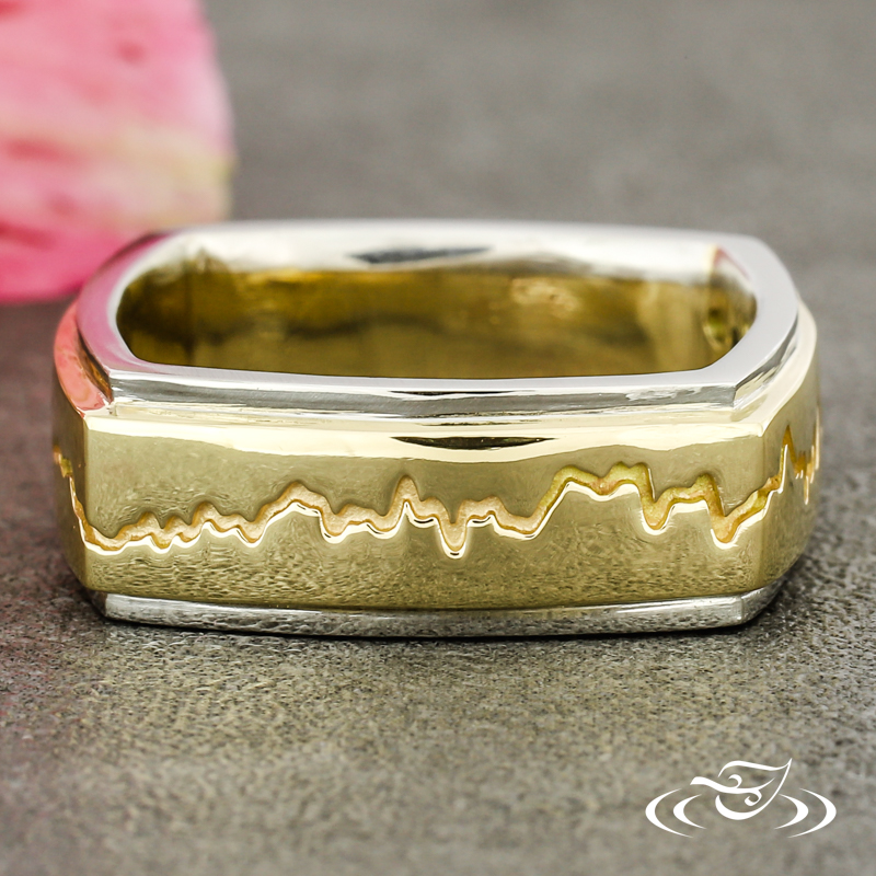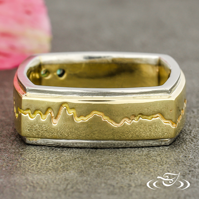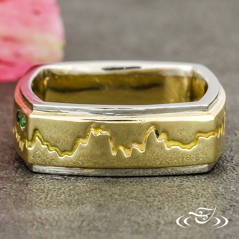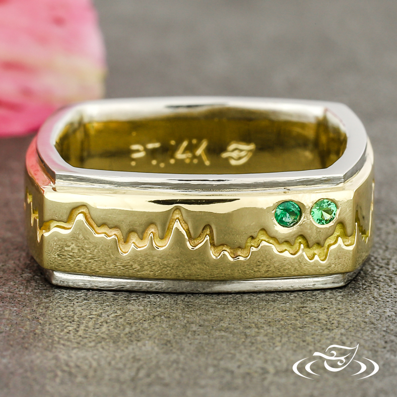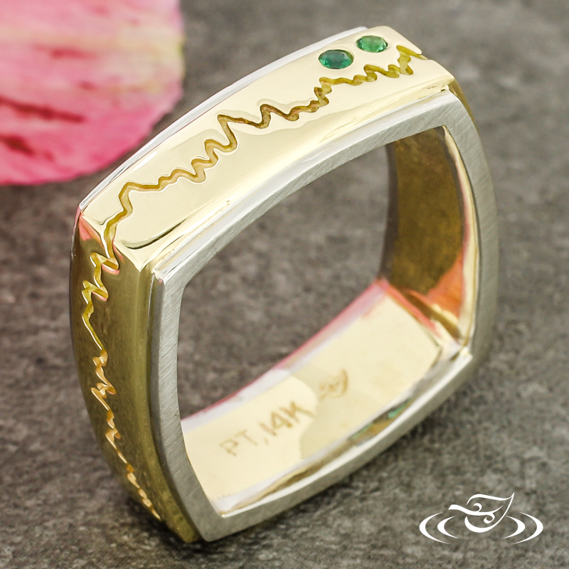 Custom 2 tone platinum and 14k yellow gold band. This band features a 14k yellow gold center with a cast in place sound wave going all the way around the band and (2) flush set GLJW provided round lab emeralds with platinum rails on either side. This band also has a square shank and a high polish finish.
