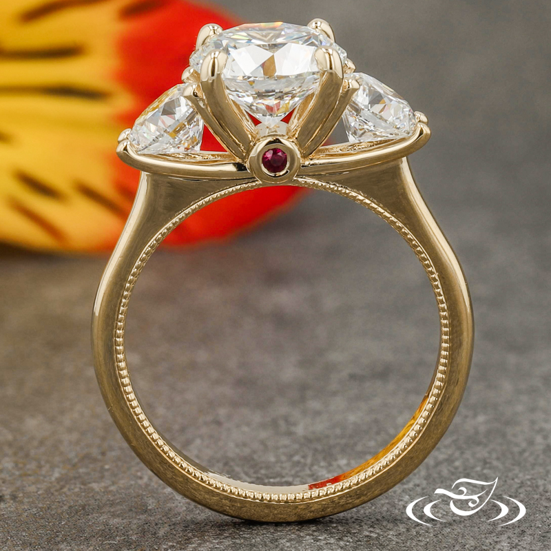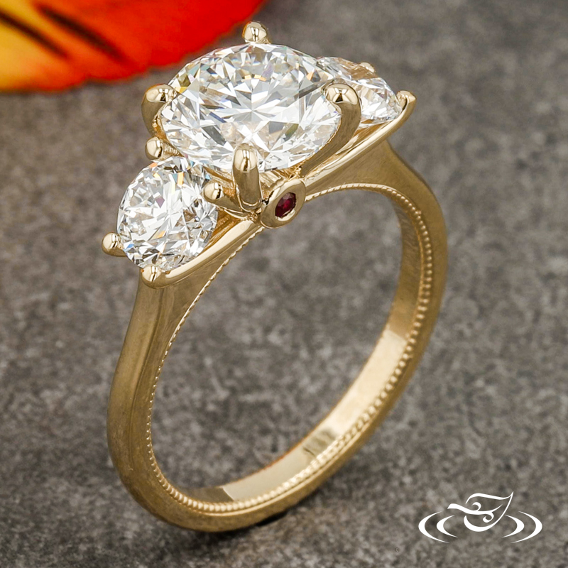 Custom 14kt yellow gold ring holding (1) 4-prong set GLJW provided round cut lab diamond center stone flanked by (2) 4-prong set GLJW provided round cut lab diamond side stones. Both side faces of the ring have (1) GLJW provided round cut ruby melee bezel set at the base of the center setting. This ring has milgrain edges on each side face and a high polish finish.