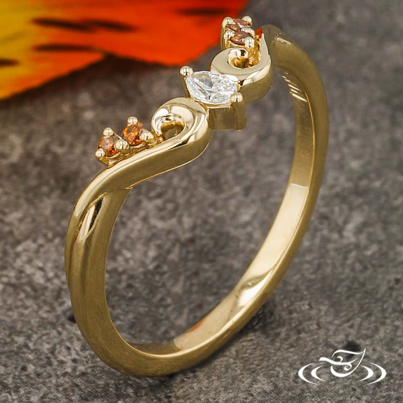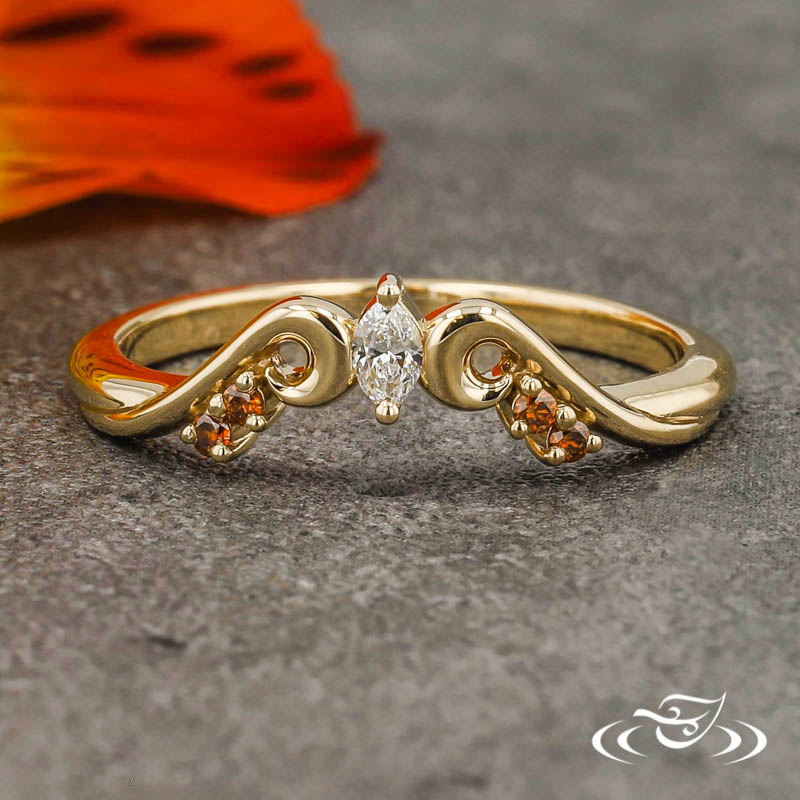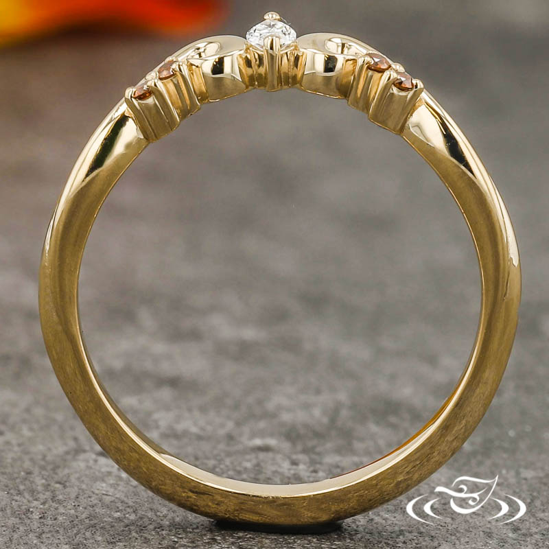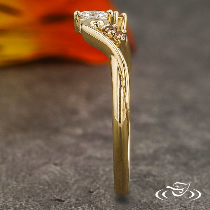 Custom 14kt yellow gold ring made to Custom Fit Engagment Ring from #212838. This Band features (4) Irradiated Orange-Brown Diamonds & (1) 3.5x2mm Marquise Diamond.