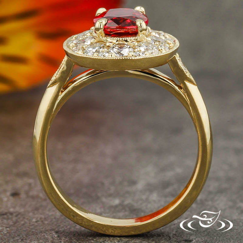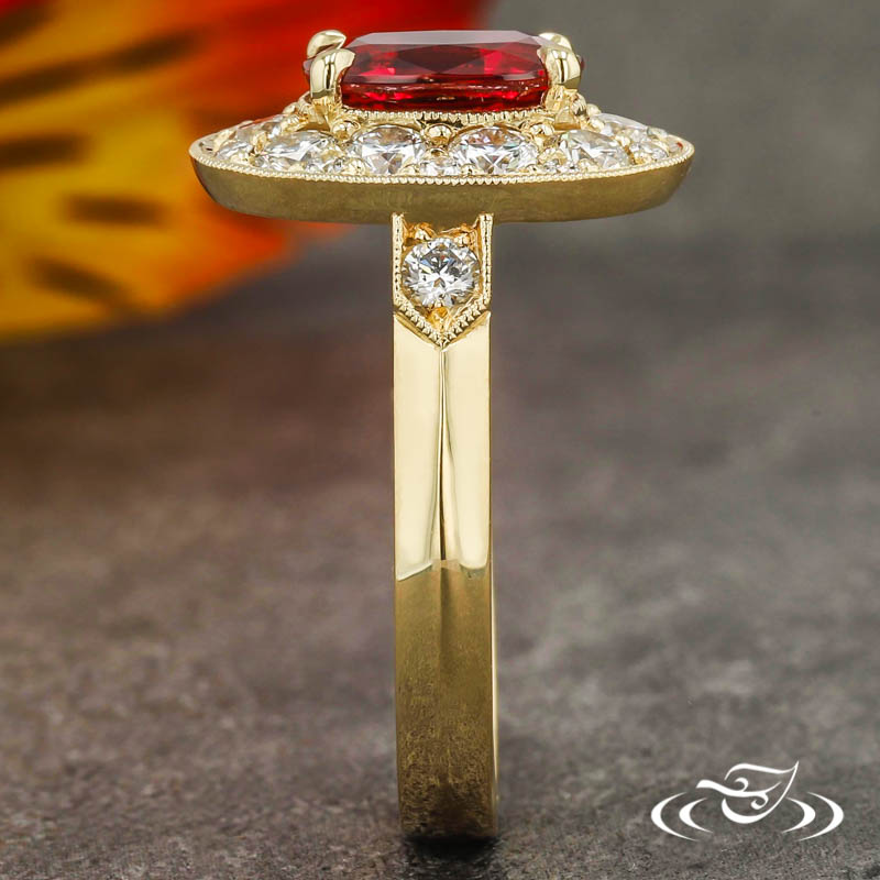 Custom 18kt yellow gold ring holding (1) 4-prong set client provided oval ruby center stone surrounded by halo of client provided round diamond melee bead set with fine milgrain detailing. Each shoulder features (1) client provided round diamond melee bead set with fine milgrain detailing. This ring also has a round shank, knife-edge profile that blends into slightly domed profile, and high polish finish.