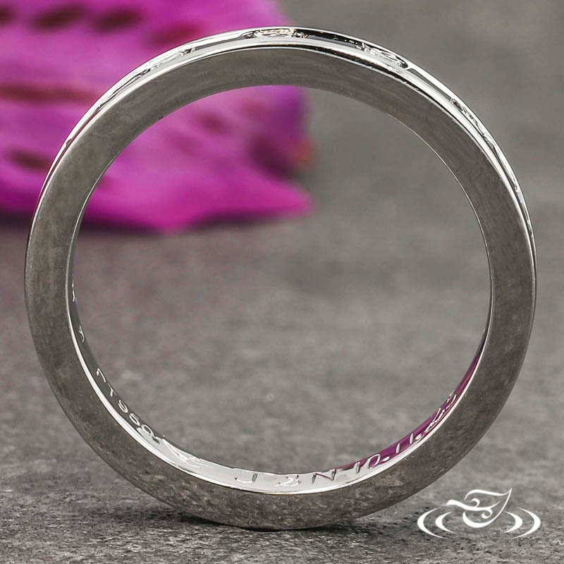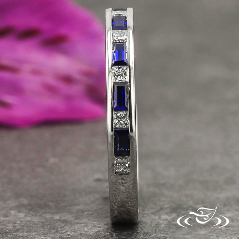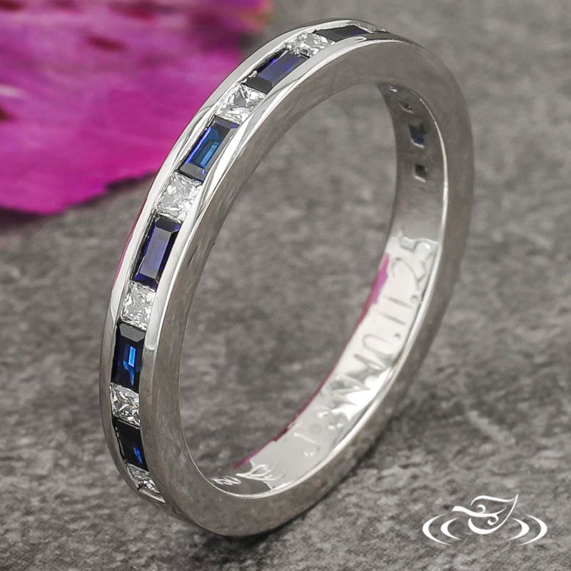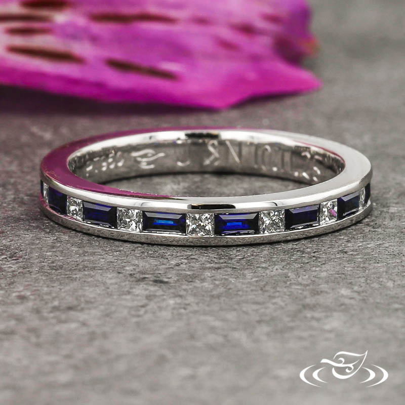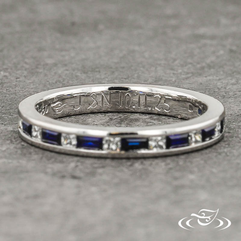 Custom 950 platinum band featuring alternating channel set princess cut lab diamonds and bagguette lab sapphires. The ring also has a high polish finish and interior engraving reading ' J&N 10.11.25 '