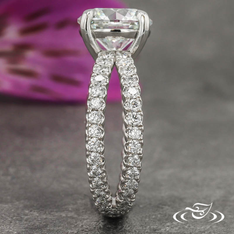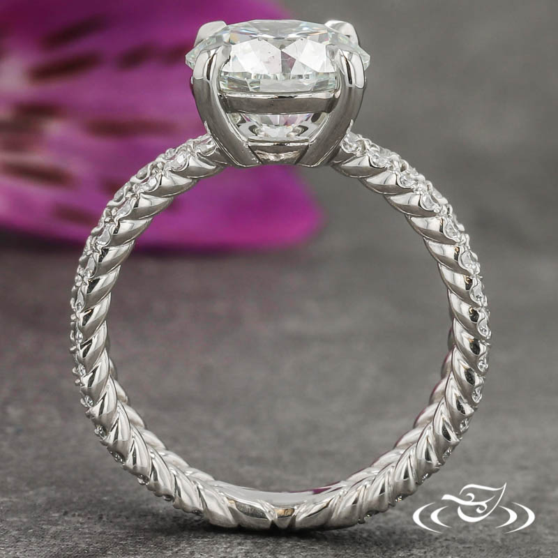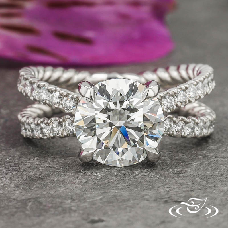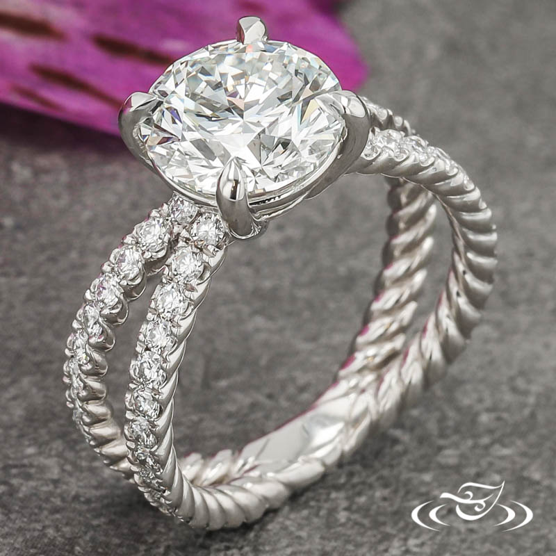 Custom 950 platinum ring holding a 4-prong set customer provided round diamond center stone. This ring also has a cable texture shank with fishtail set Lab Diamond Melee set around the shank.