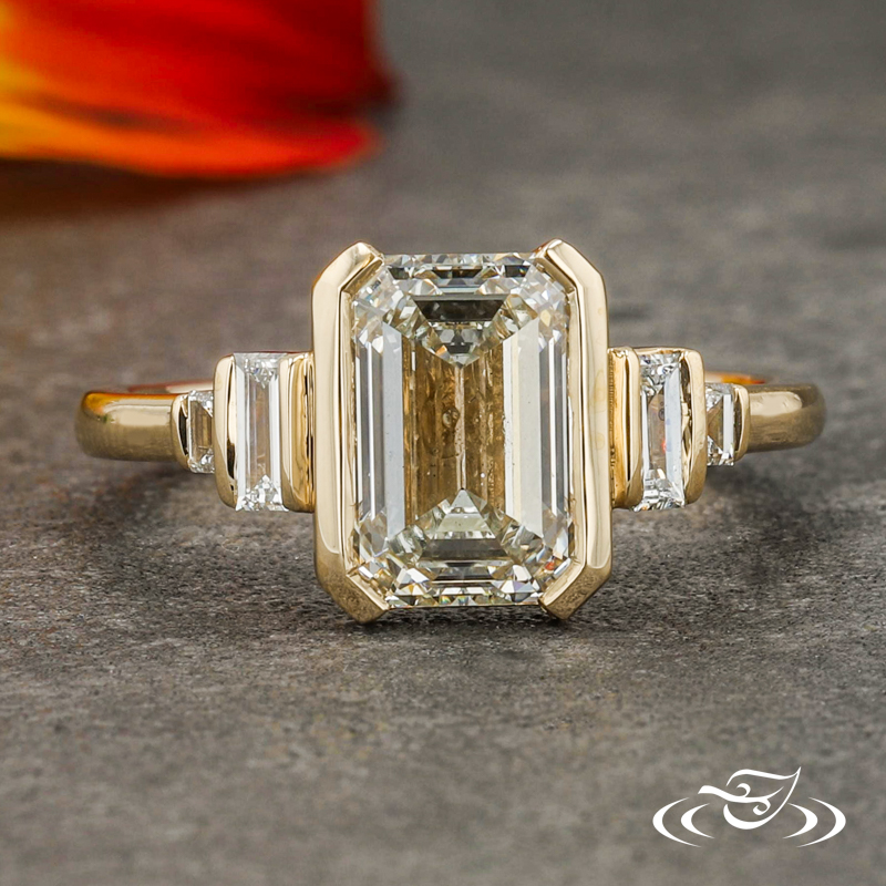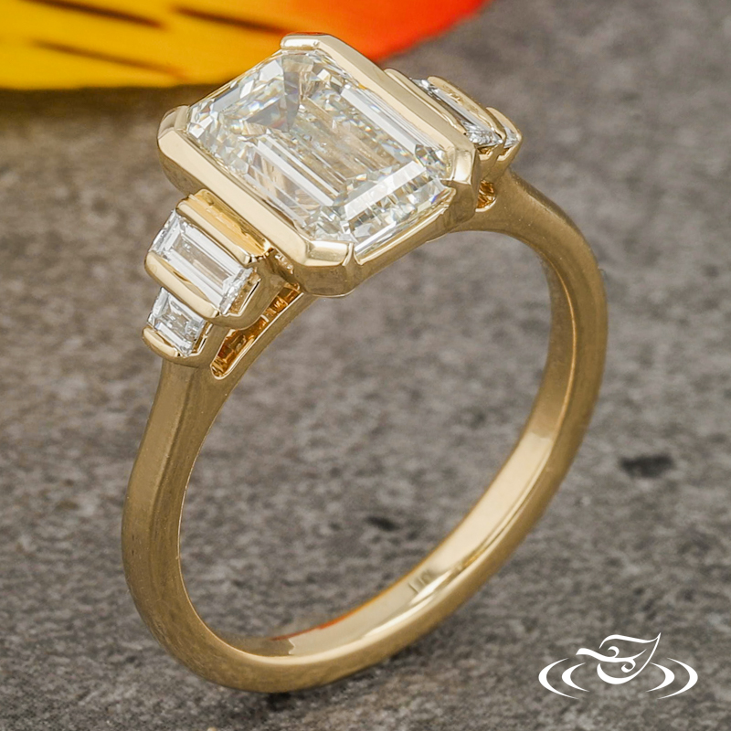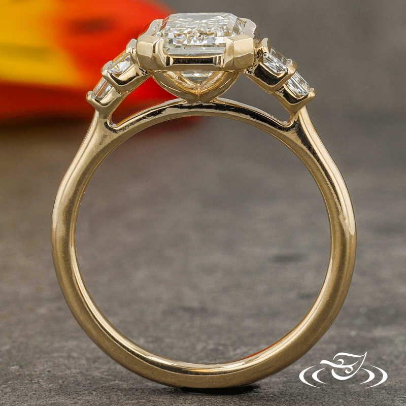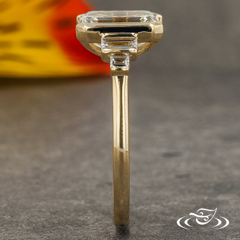 Custom 14kt yellow gold ring holding a half bezel set GLJW provided emerald cut lab diamond center stone. (4) GLJW provided baguette lab diamond. This ring also has a shank and a high polish finish.