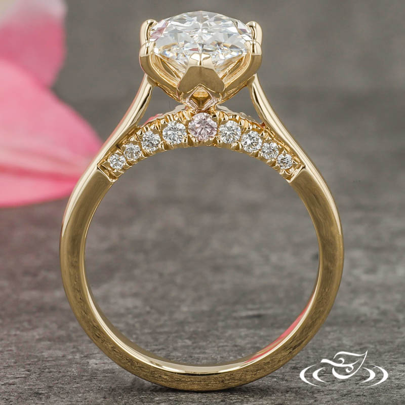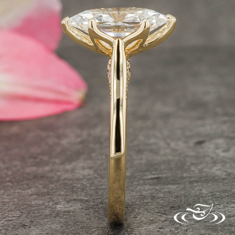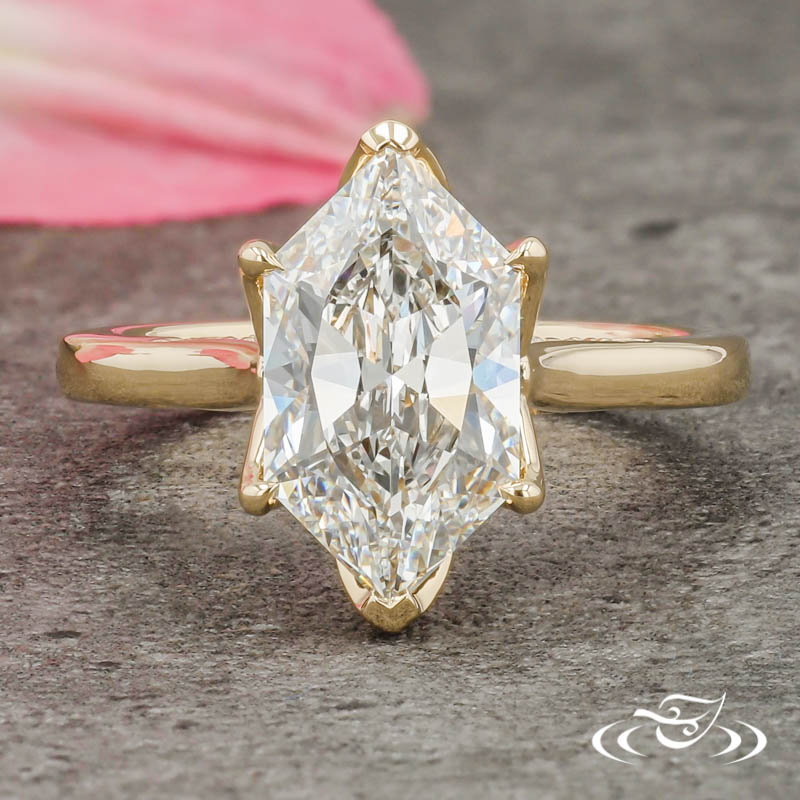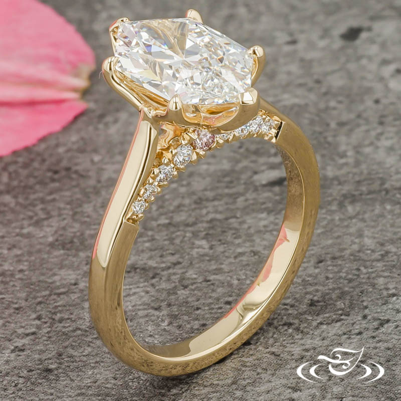 Custom 14kt yellow gold solitaire ring holding a chevron prong GLJW provided elongated hexagon lab diamond center stone. With (8)GLJW provided round lab diamonds and (1) GLJW provided round pink diamond fishtail set on the bridge on either side. This ring also has a round reverse taper shank and a high polish finish.
