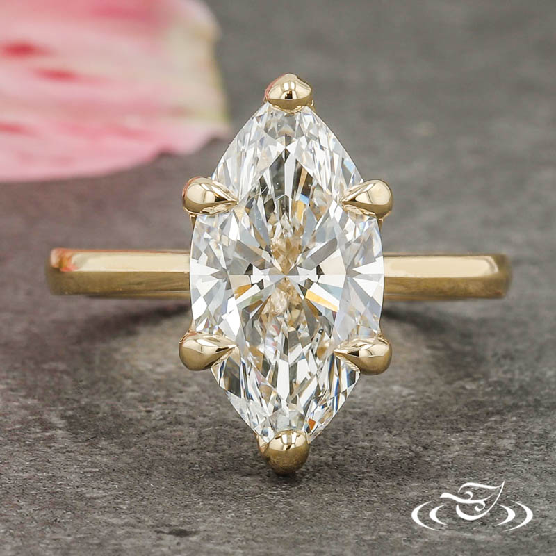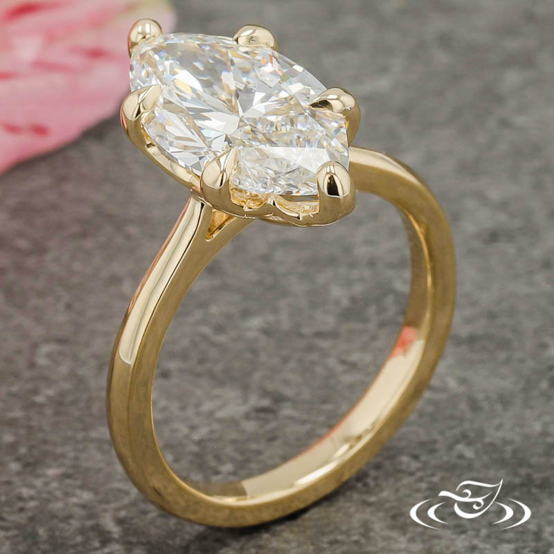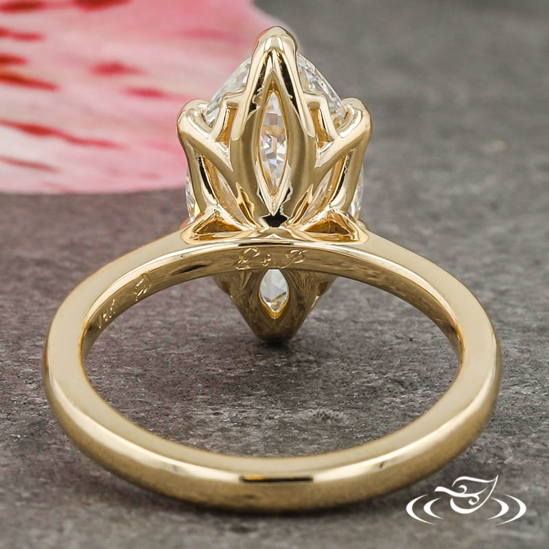Custom 14kt yellow gold solitaire ring holding (1) GLJW provided marquise cut lab diamond center stone 6-prong set within a pierced tulip inspired setting. This ring has a round shank and a high polish finish.