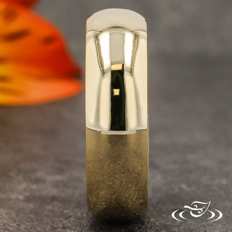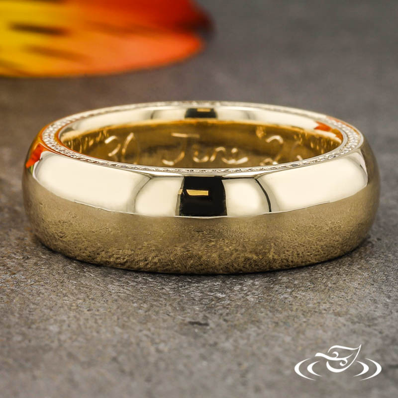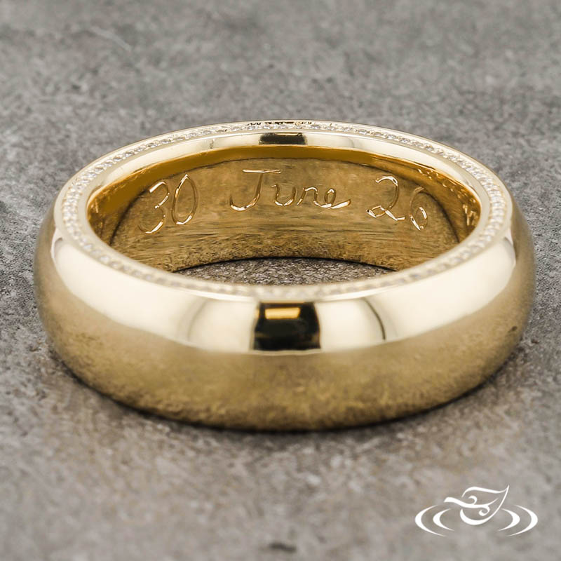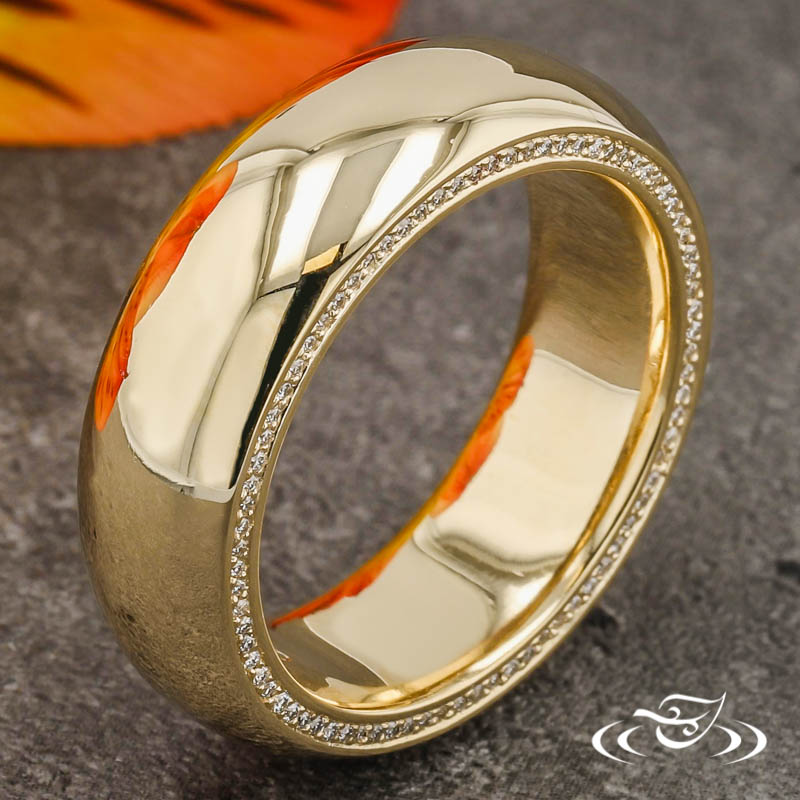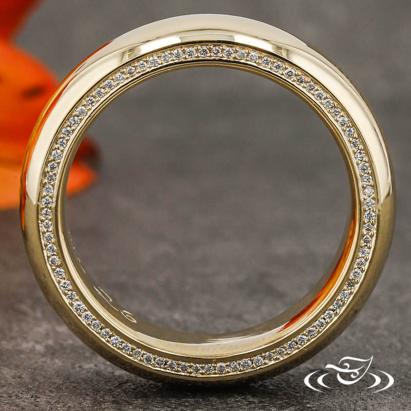 Custom 14kt yellow gold half round band with (82) .6mm Lab Diamonds set on each side of the band. This band also has a High Polish Finish.