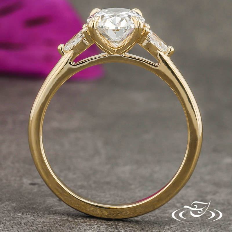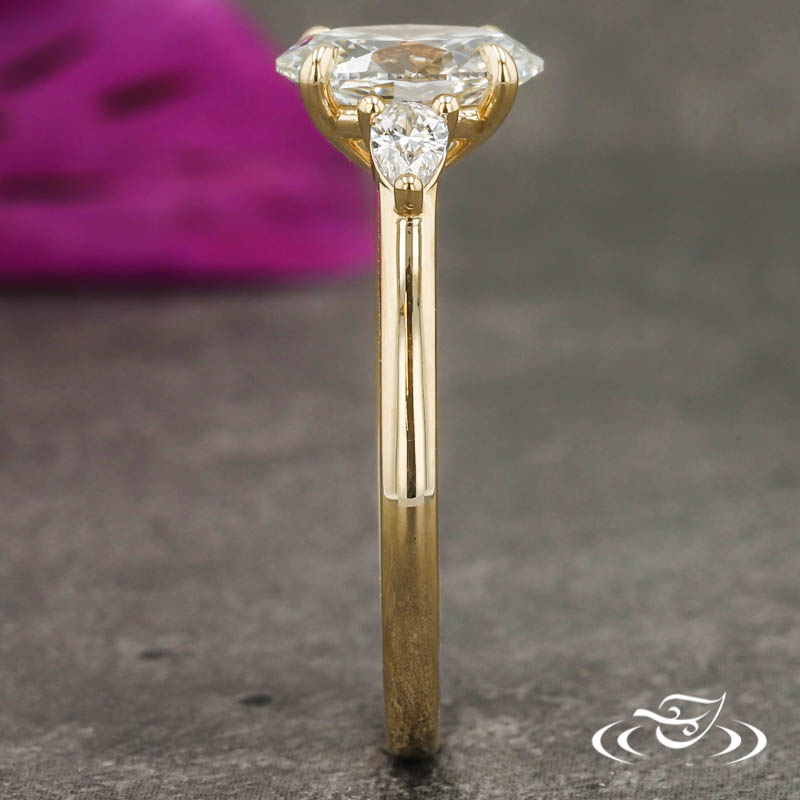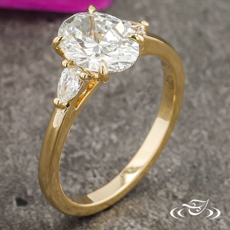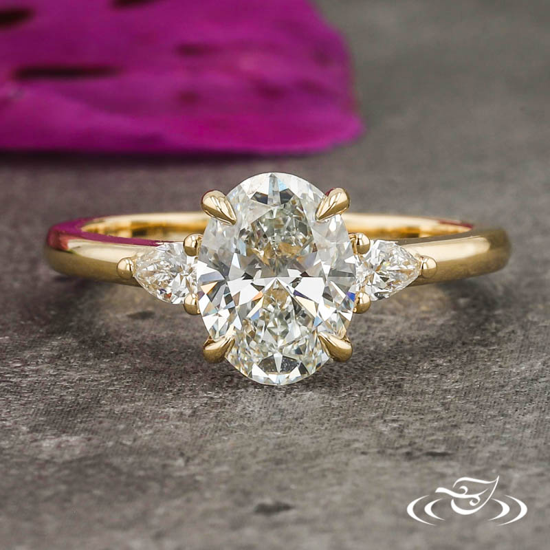 Custom 14kt yellow gold ring holding a 4-prong set GLJW provided oval lab diamond center stone. This ring also (2) Pear Shape Lab Diamonds on either side of the Center Setting & a round reverse taper shank and a high polish finish.