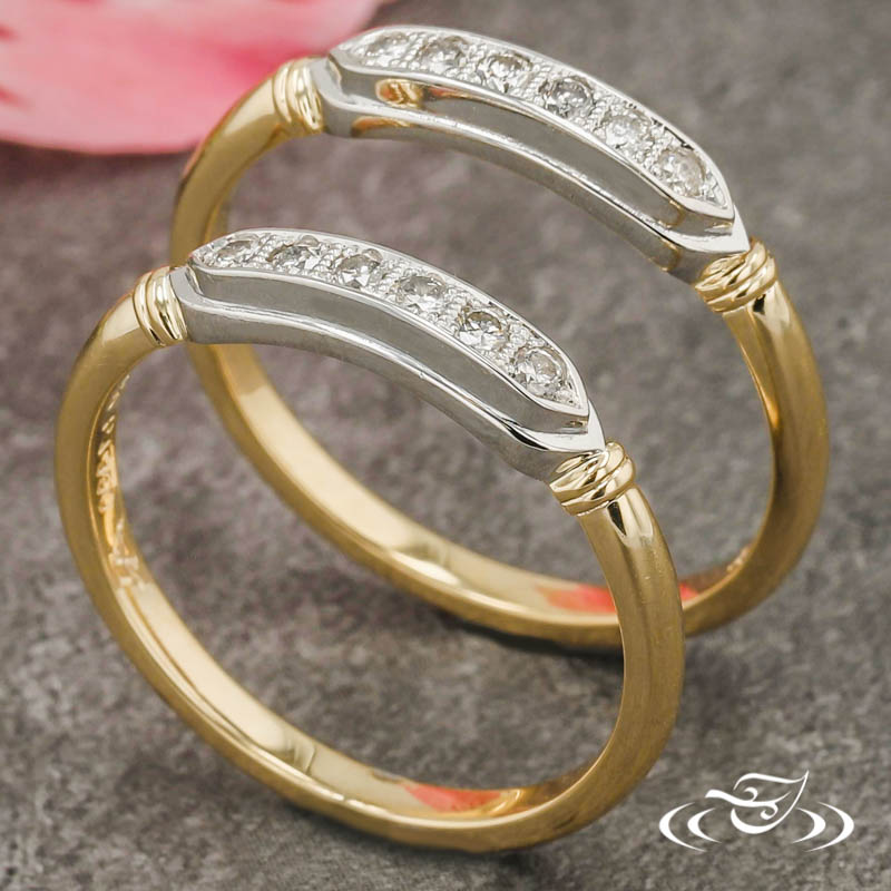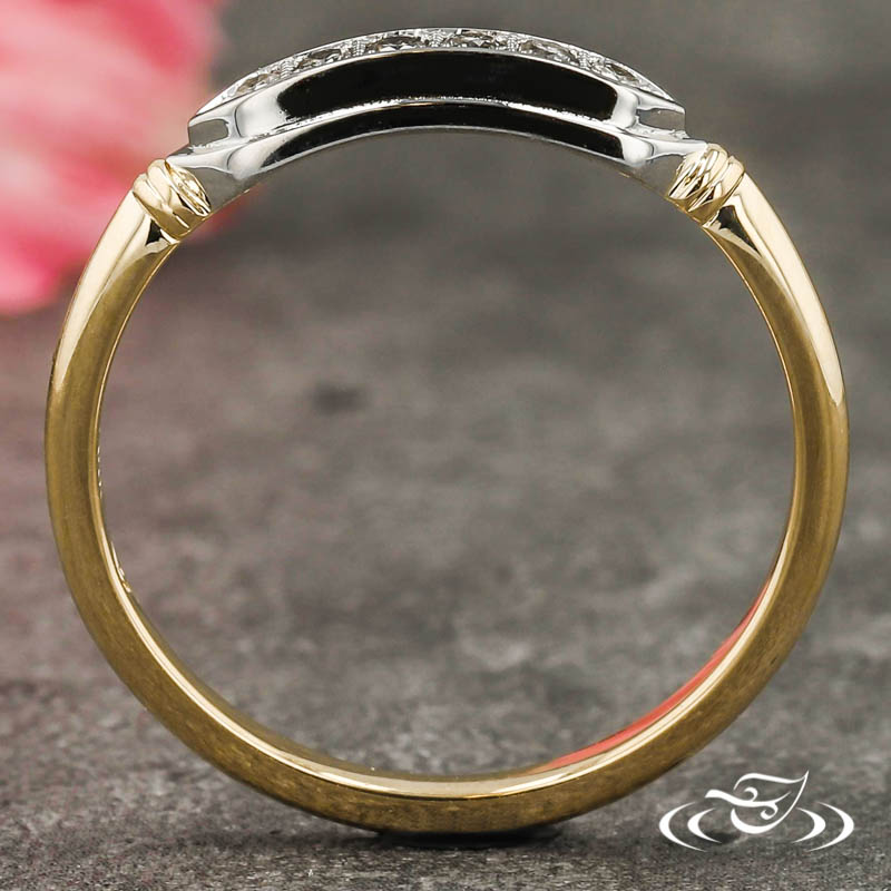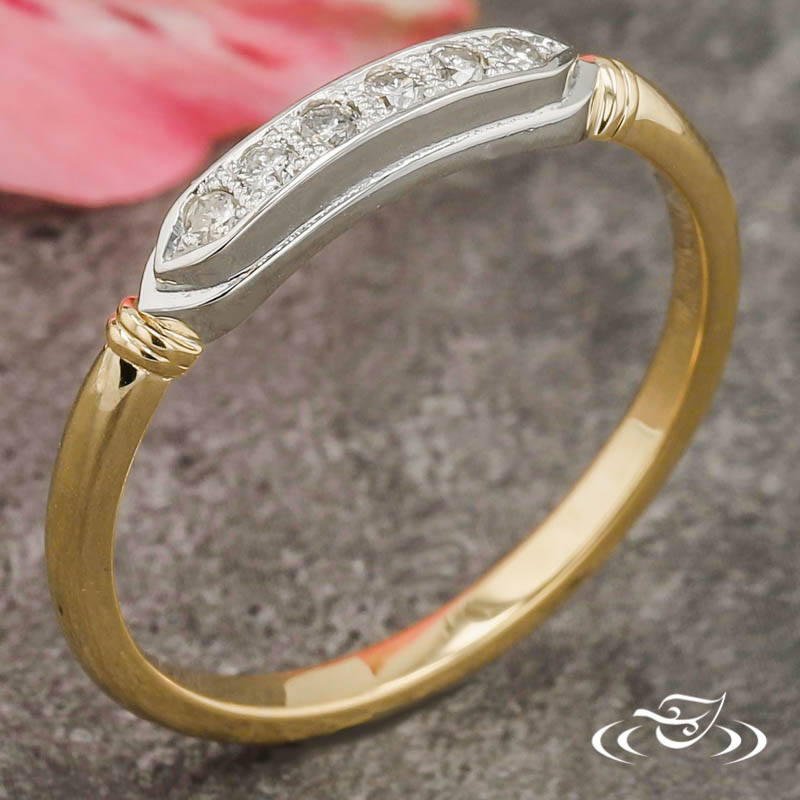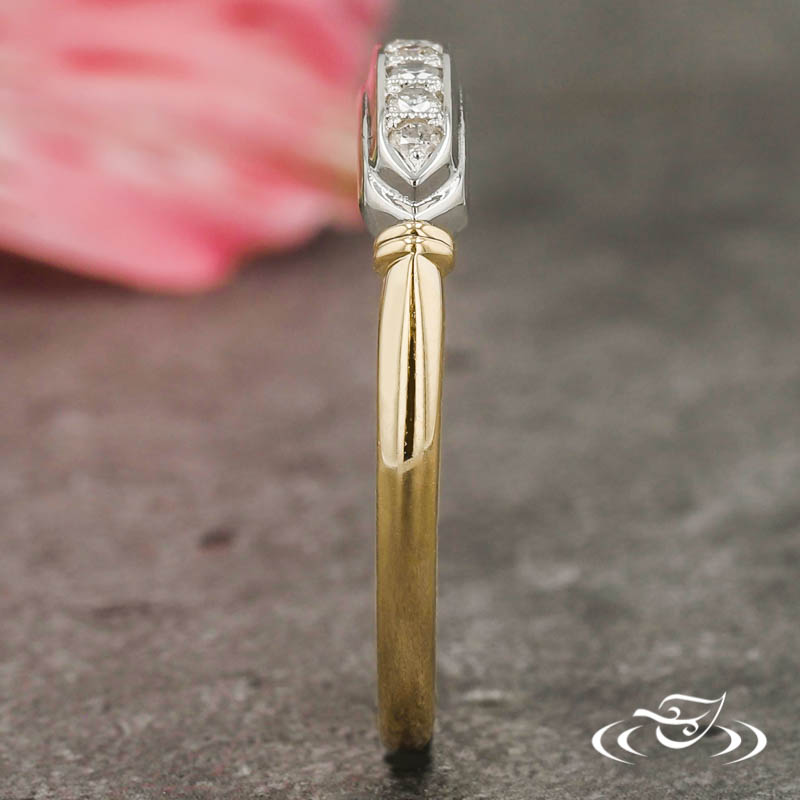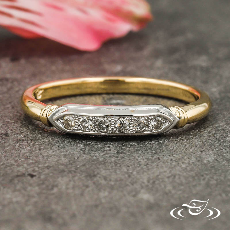 Custom 2 tone platinum and gold band with (6) customer stones set in the top face. This band also has a shank and a high polish finish.