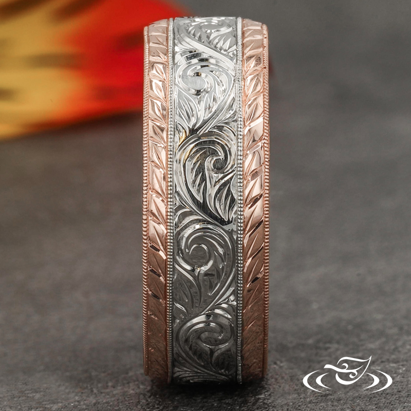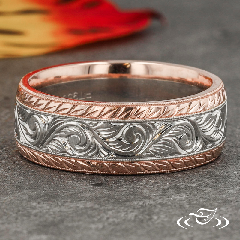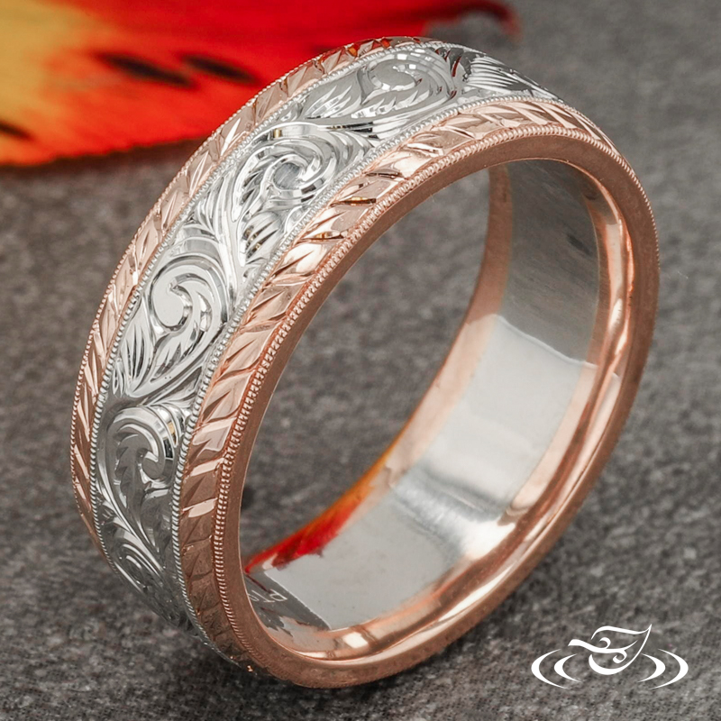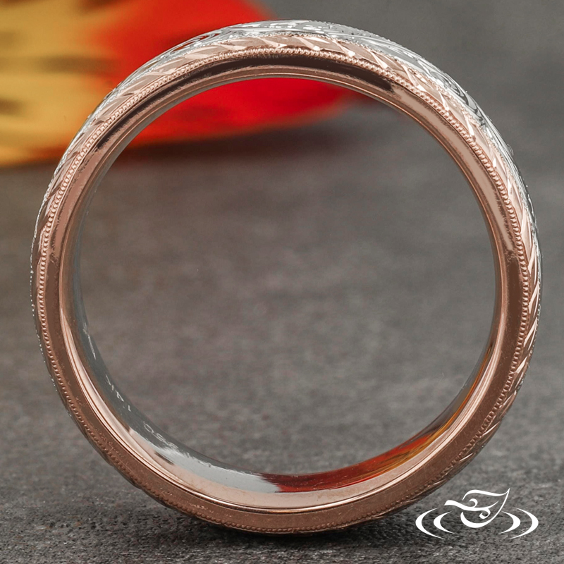 Custom two-tone wedding band comprised of a 5mm wide 950 platinum center section flanked by (2) 1mm wide 14k rose gold beveled edges. The center section has a hand engraved scroll pattern eternity style around the top face while both rails have a hand engraved half wheat patterning. This band has a round, flat comfort fit profile, and a high polish finish.