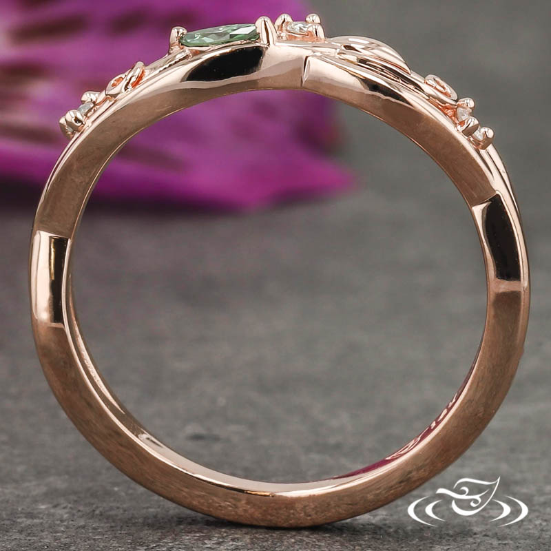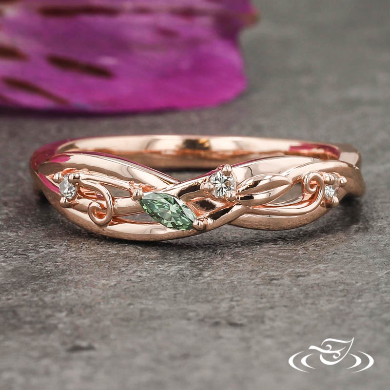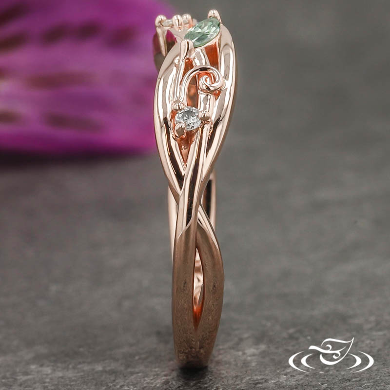 Custom 14kt rose gold band made to fit next to the customer's custom made engagement ring. The round band has a double strand twisting motif comprising the top half with pierced openings between the twists. Two hand fabricated filigree curls fill some open space. A total of (3) customer provided round cut diamond melee and (1) GLJW provided marquise cut apple green diamond melee are prong set within the strands on the top ~third. This band has a round shape and a high polish finish.