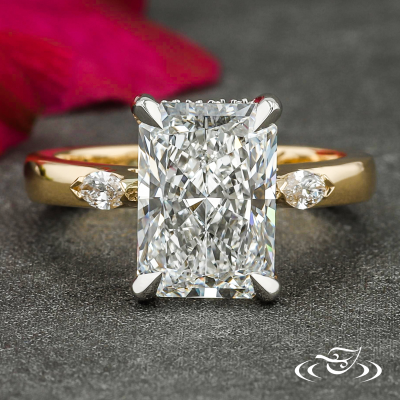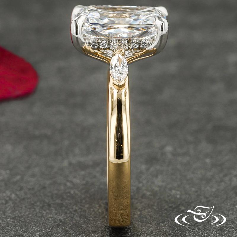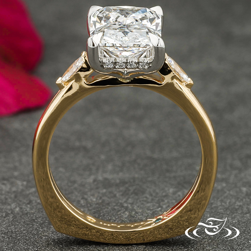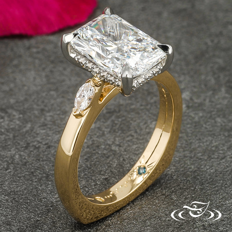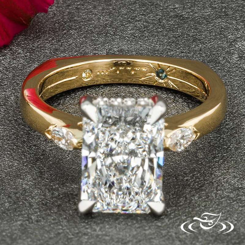 Custom 2 tone platinum and 18k yellow gold three stone ring holding a 4-prong set GLJW provided radiant lab diamond center stone flanked by (1) GLJW provided marquise lab diamonds chevron set on either shoulder, with (20) round lab diamonds fishtail set in a hidden halo. This ring also features custom inside engraving with (1) GLJW provided round peridot and (1) GLJW provided round blue topaz flush set in the inside. This ring also has a round shank and a high polish finish.