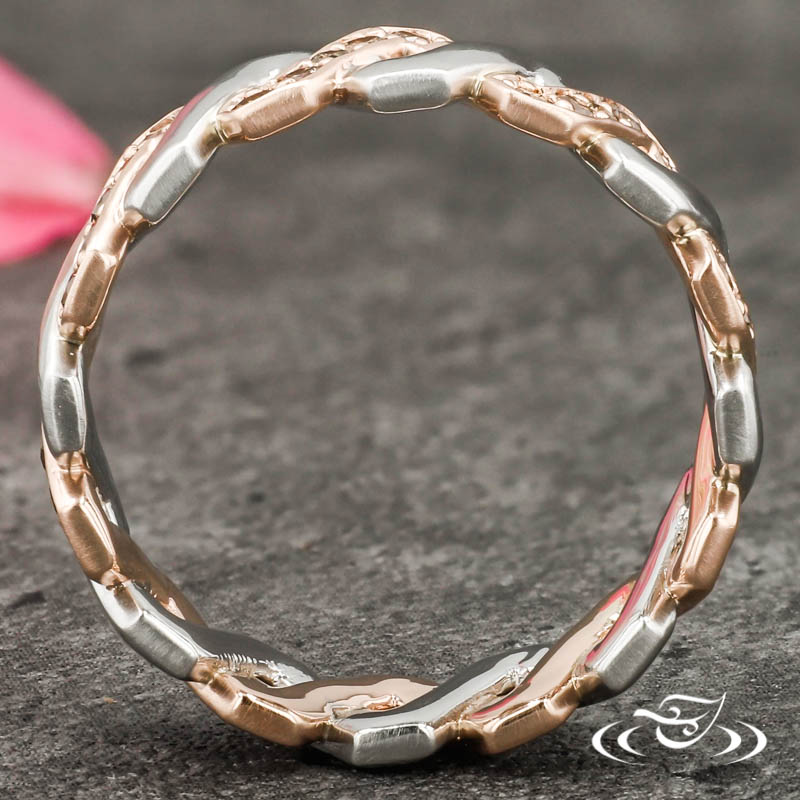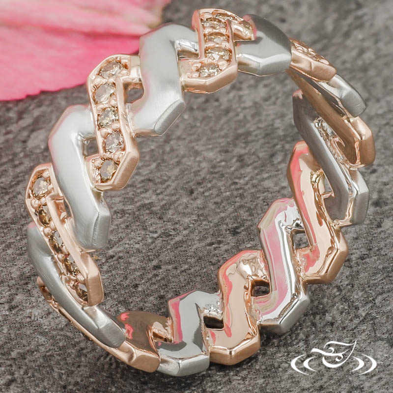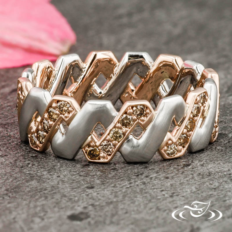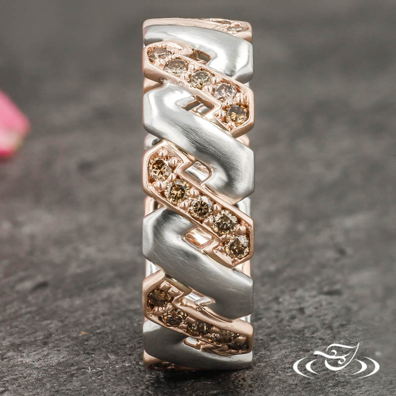 Custom 2 tone interlocking platinum and 14k rose gold band. This band features (40) GLJW provided round champagne diamonds bead set on the 14k rose gold portion going all of the way around the band. This band also has a round shank and a matte finish.