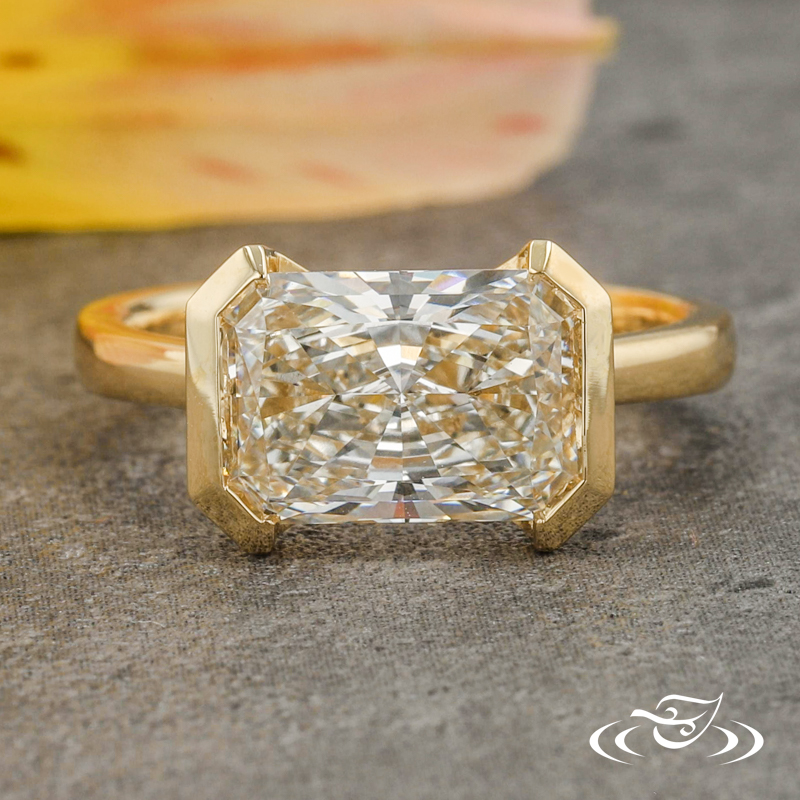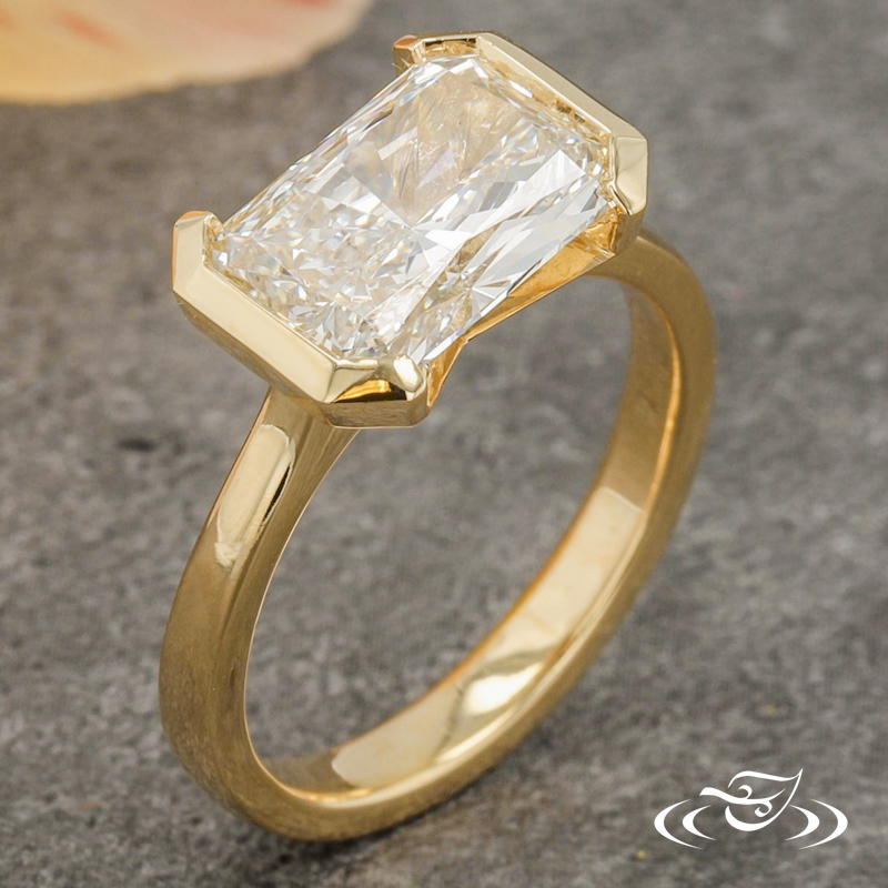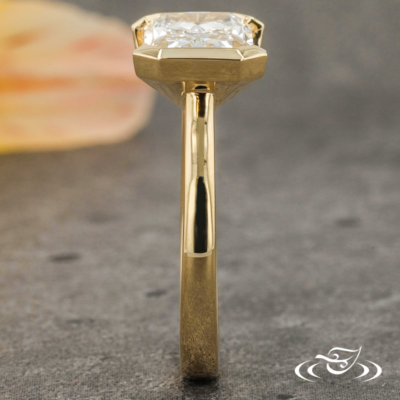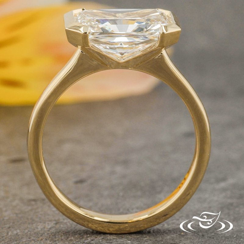 Custom 18kt yellow gold ring holding a GLJW provided radiant lab diamond center stone. This ring also has a round reverse taper shank and a high polish finish.