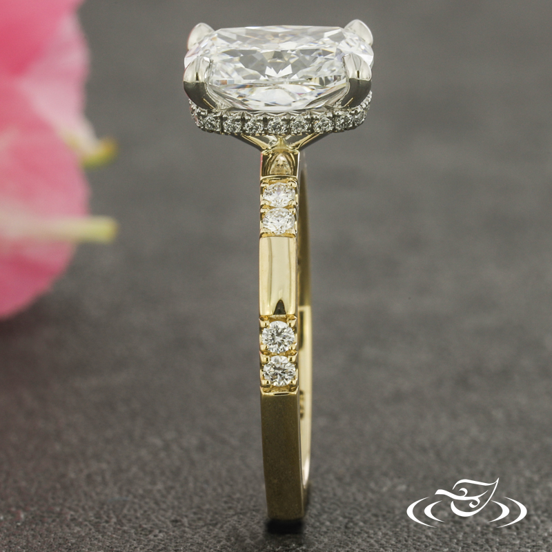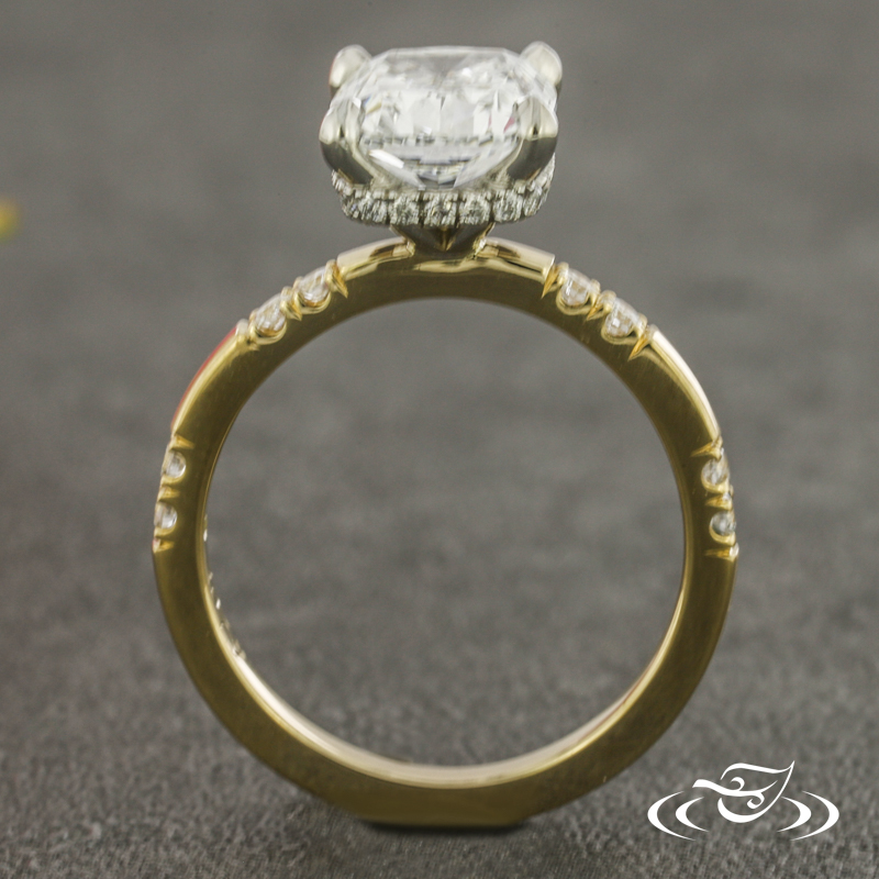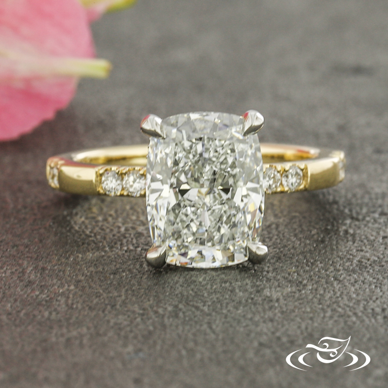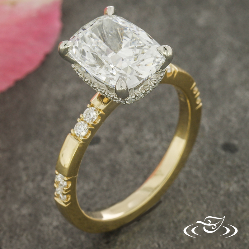 Custom 2 tone platinum and gold ring holding 2.25ct Cushion Brilliant Lab Diamond. This ring also has a melee fishtail set along the shank and french set in the hidden halo. The inside features custom engraving w/ birth stones. The ring also has a high polish finish.
