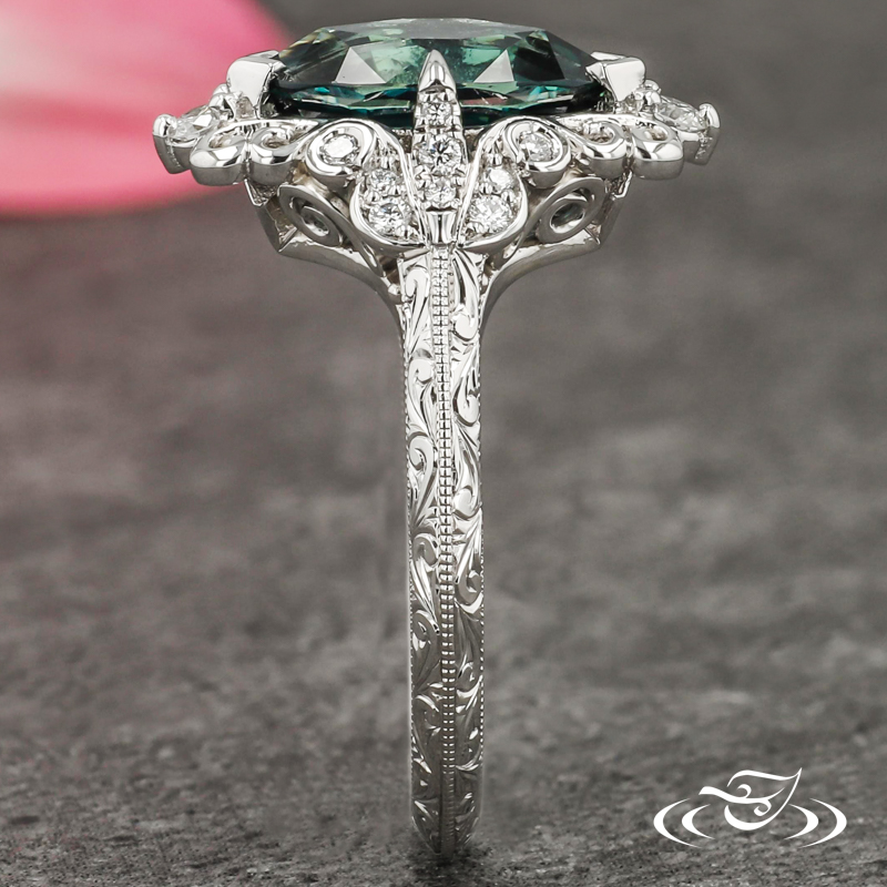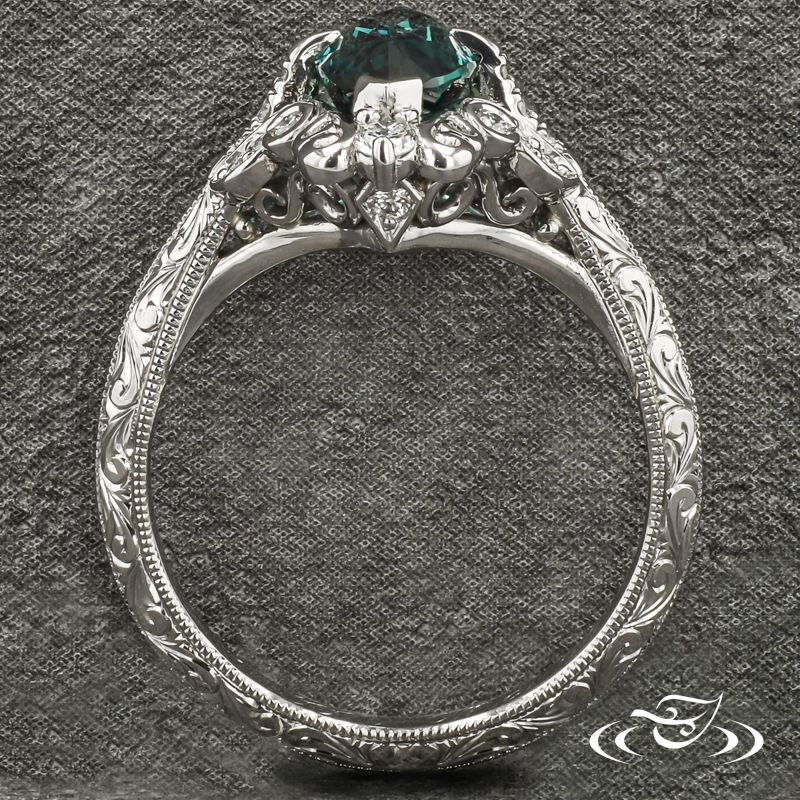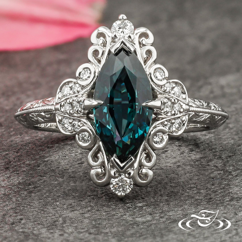 Custom 950 platinum antique inspired ring holding a chevron prong GLJW provided marquise sapphire center stone surrounded by cast in place curls holding (20) GLJW provided round diamonds. Expertly crafted with (4) handmade fine wire filigree curls under the center stone with (2) bead set GLJW provided round diamonds set in the center of the design. Hand engraved with a scroll pattern on the top face of a knife edge shank, eternity style. This ring also has milgrain edges, a round shank and a high polish finish.