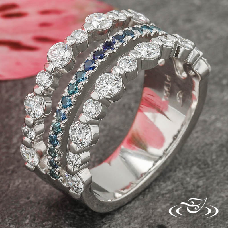 Custom 950 platinum band with a split shank forming essentially (3) separate bands along the top ~two-thirds that connect into a singular tapering shank at the base. The outer bands hold a total of (22) GLJW provided round cut lab diamond melee shared prong set in alternating size order. The center band holds (22) GLJW provided round cut sapphire melee fishtail set in a gradient color pattern with light blue towards the ends and dark blue in the center. This band has a round shape and a high polish finsih.