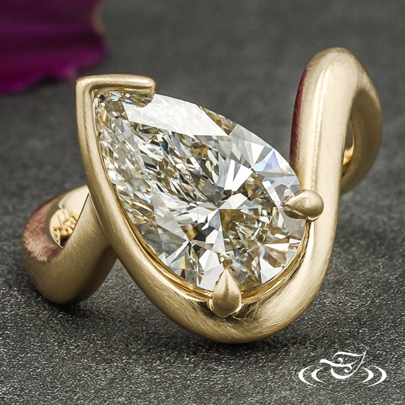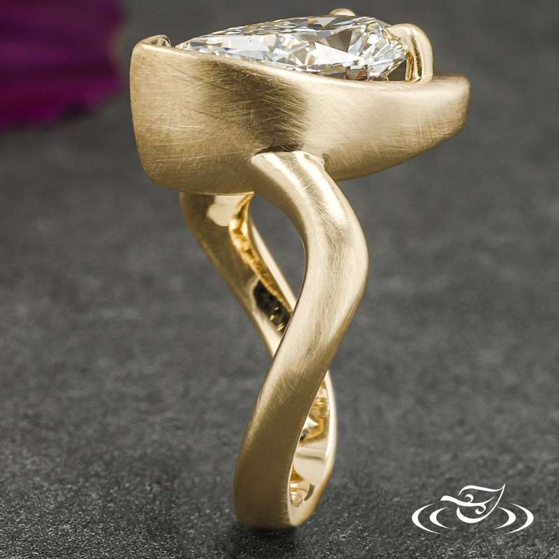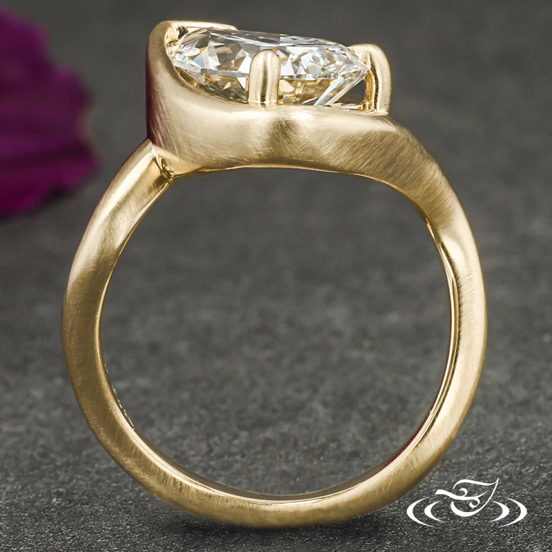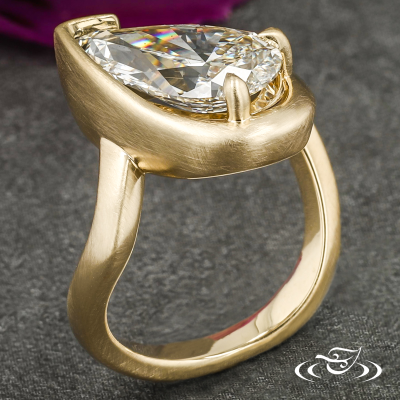 Custom 14kt yellow gold modern sculptural solitiare engagement ring holding a hybrid half bezel and prong set GLJW provided pear lab diamond center stone. This ring also has a round sculptural wavy shank with a matte finish.