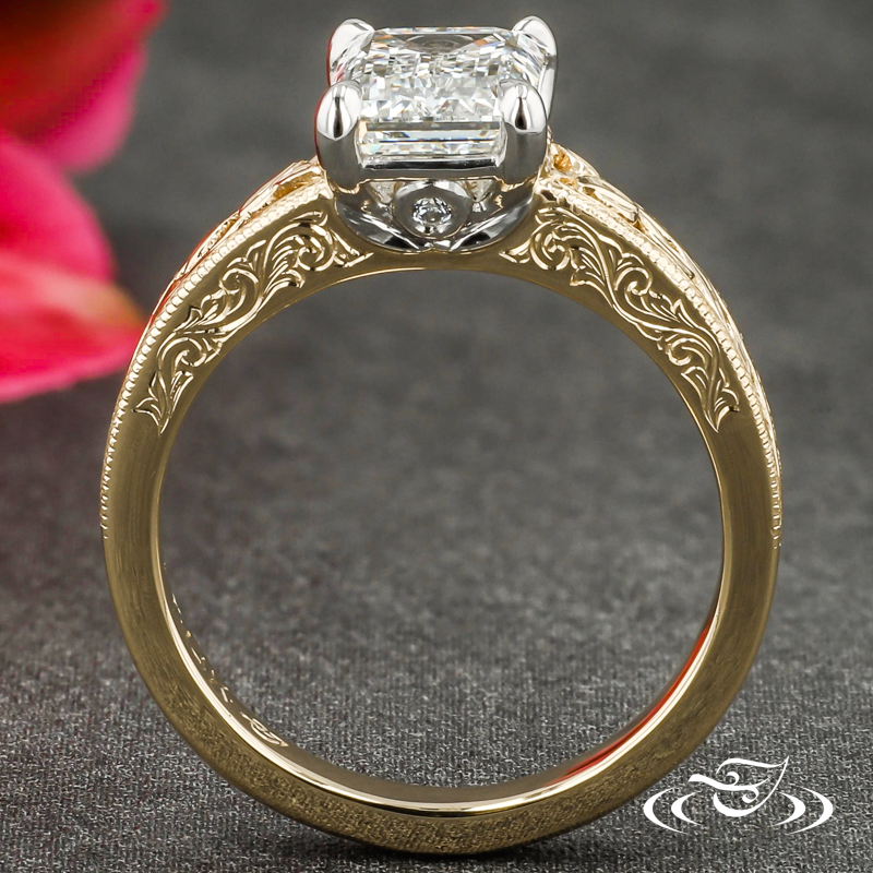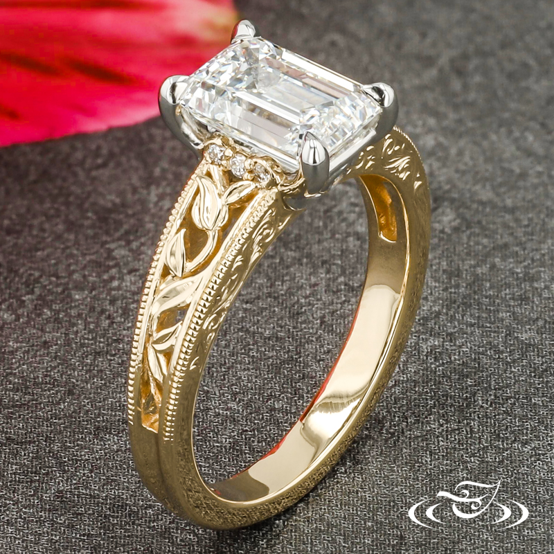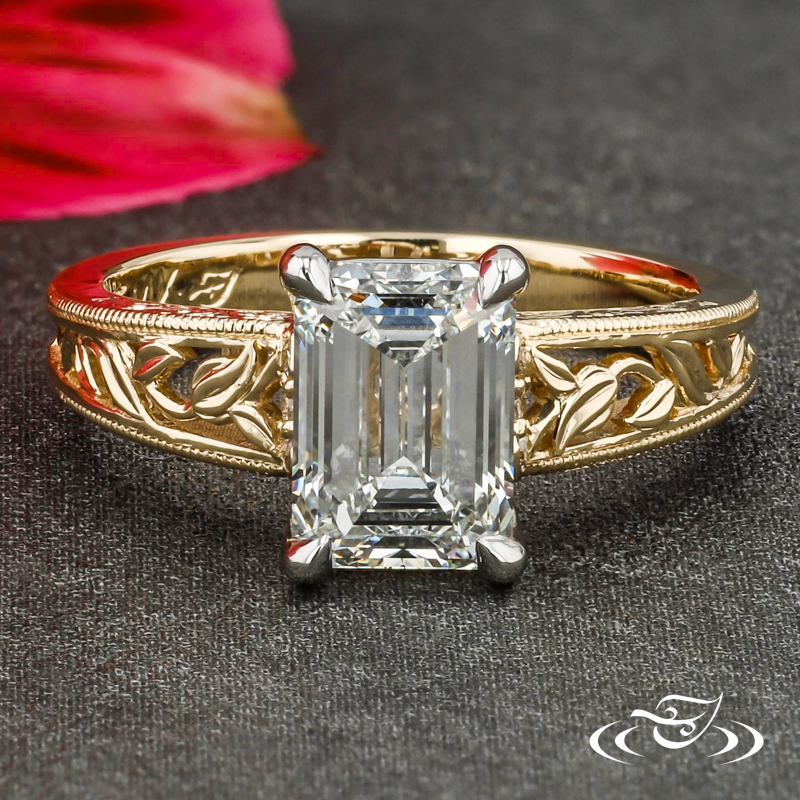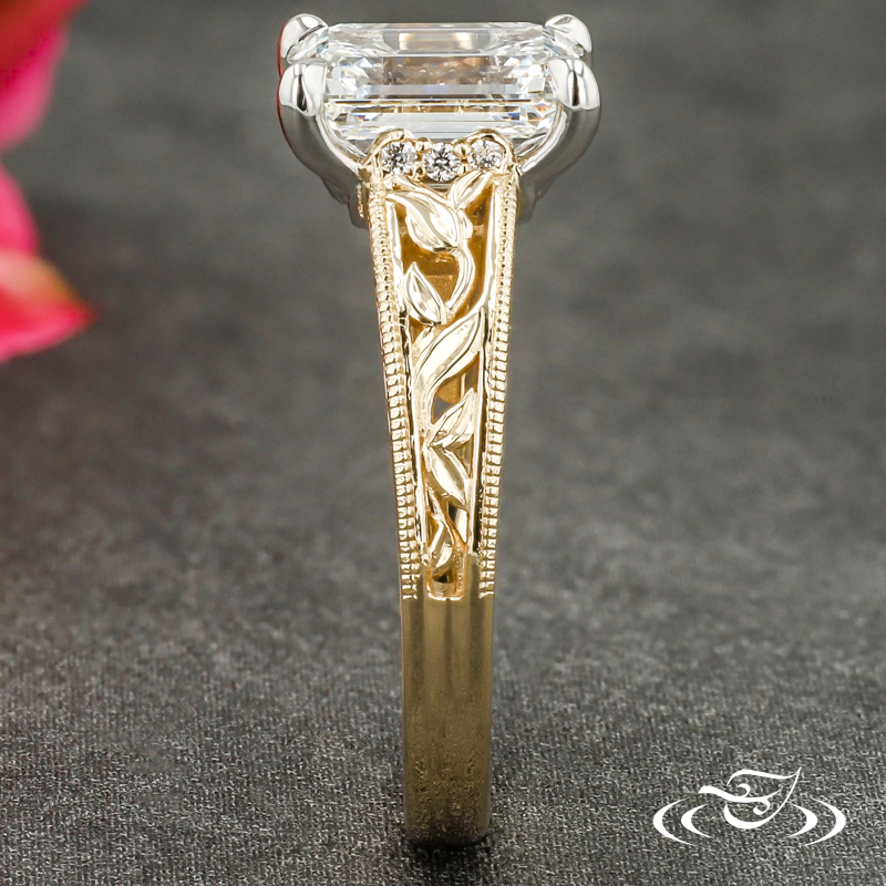 Custom 2-tone ring featuring (1) 4-prong set GLJW provided emerald cut lab diamond center stone in platinum head with (1) GLJW provided round lab diamond melee bezel set on each side gallery above (2) leaves. Round, 14k yellow gold shank has flat profile and pierced shoulders containing hand engraved leaves with fine milgrain detailed edges. (3) GLJW provided round lab diamond melee are prong set at top of shoulders, side faces feature hand engraved scroll motifs at top. All with high polish finish.