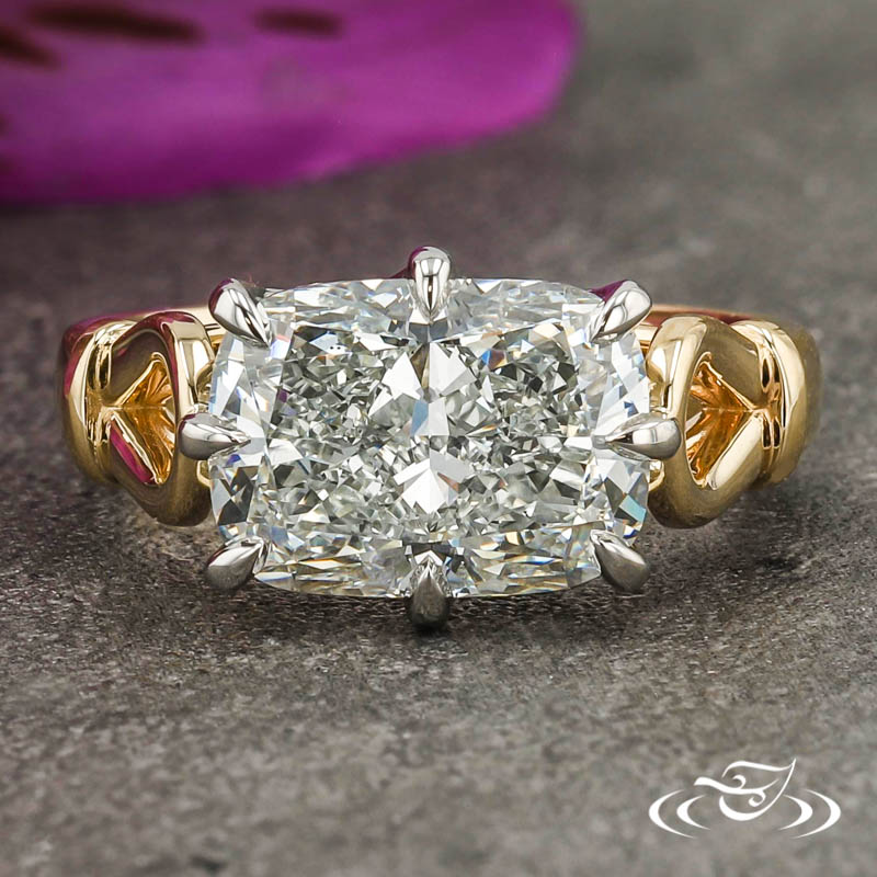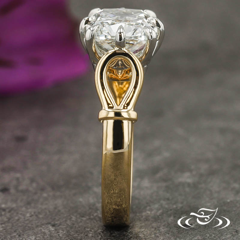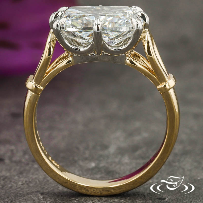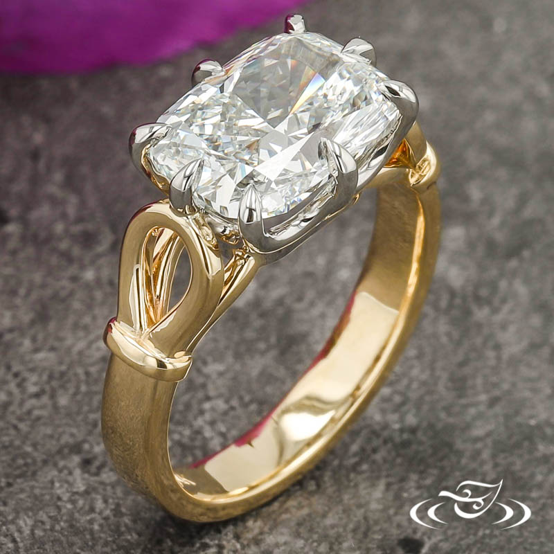 Custom two-tone solitaire ring holding (1) customer provided elongated cushion cut lab diamond center stone set lengthwise from east to west with (8) delicate pointed prongs. The center setting is 950 platinum while the remainder of the ring is 14k yellow gold. A pierced loop detail with a horizontal raised bar accents each shoulder. All with a high polish finish.
