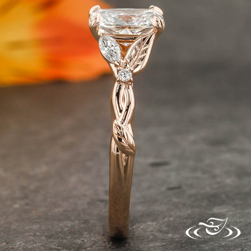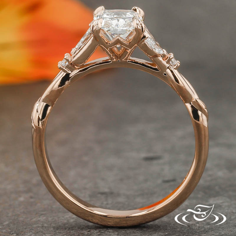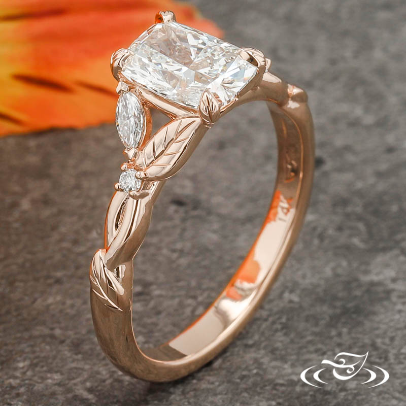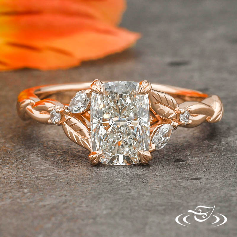 Custom 14kt rose gold ring holding a 4-leaf-prong set GLJW provided cushion lab diamond center stone. This Marquise & Round Lab Diamond Accent gems with cast in place leaves & engraving details.