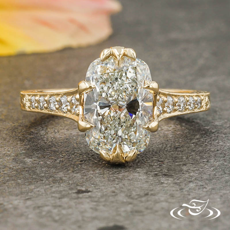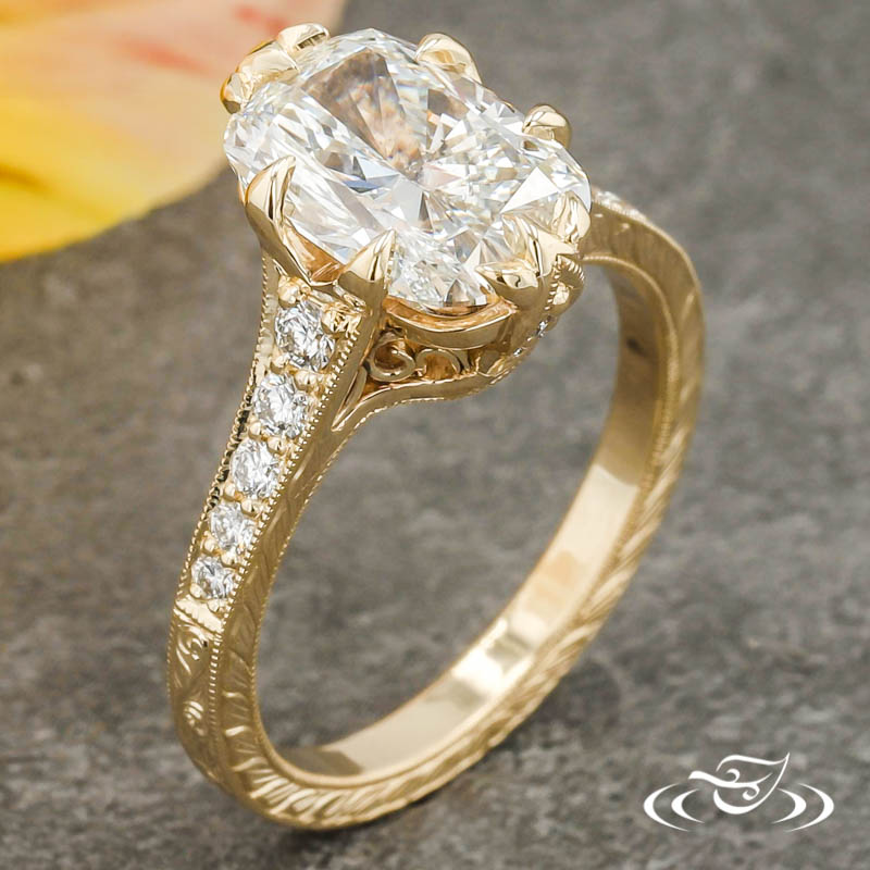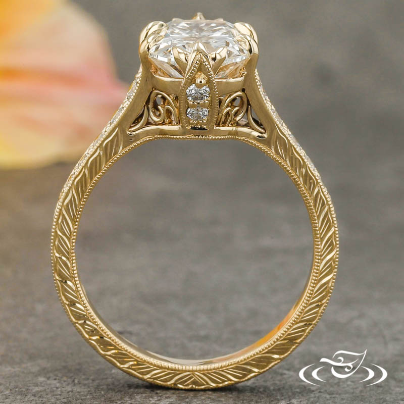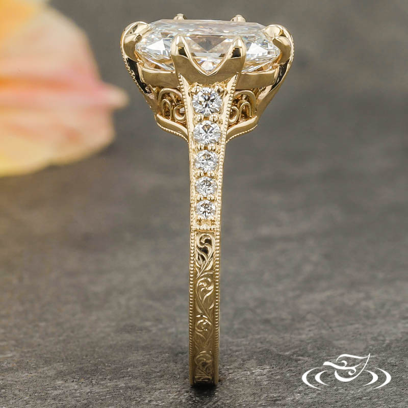 Custom 14kt yellow gold ring holding (1) previously purchased cushion cut lab diamond center stone 4-prong set within a hybrid style setting with triple prongs on the north and south ends and (4) claw prongs on the sides. The north and south side faces of the center setting each hold (1) bead set GLJW provided round cut lab diamond melee. The open panels flanking the stones on the side faces are filled with hand fabricated filigree curls. The tapering shoulders each hold an additional (5) GLJW provided round cut lab diamond melee. This ring has hand engraved scroll patterning along the top face and hand engraved half wheat patterning on both side faces. All with milgrain edges and a high polish finish.