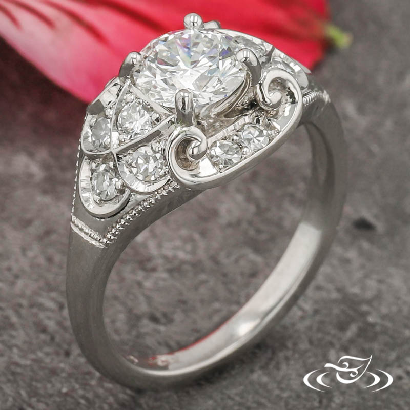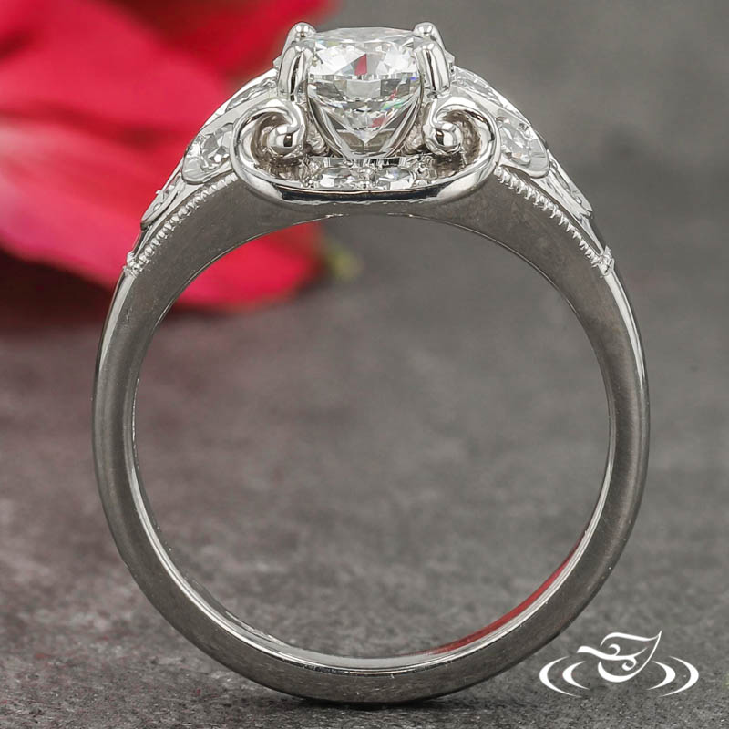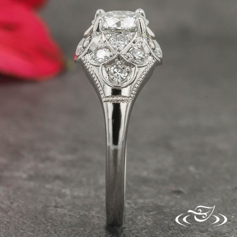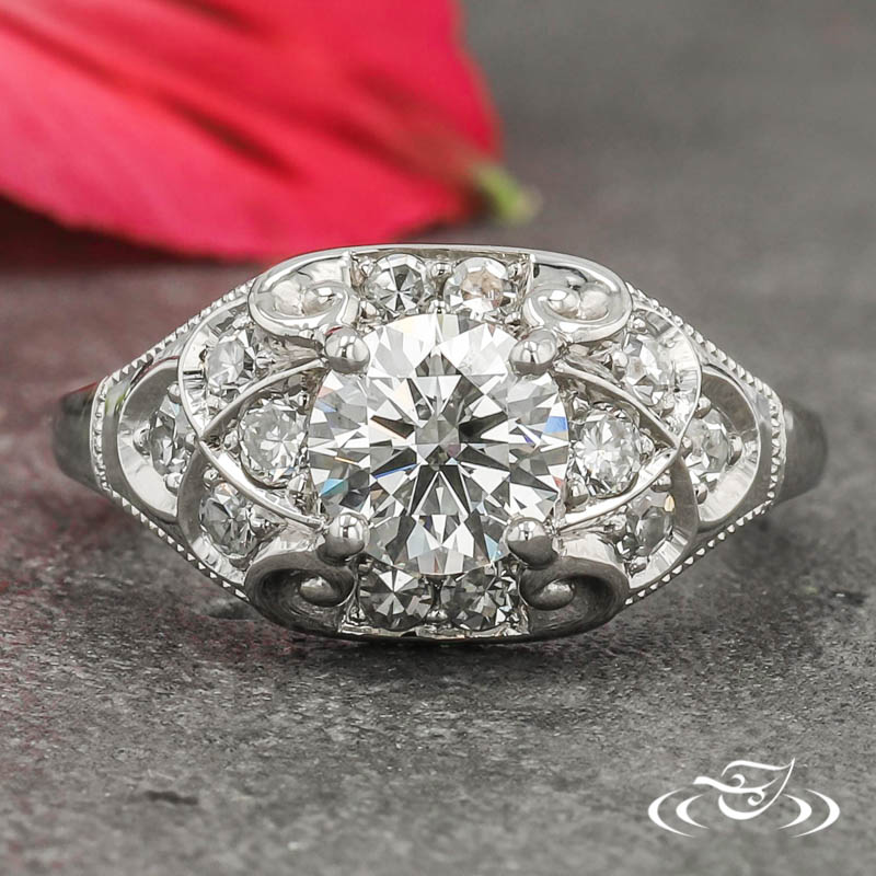 Custom 950 platinum antique-inspired ring holding (1) 4-prong set GLJW provided round cut lab diamond center stone. A unique style halo surrounds the center setting holding a total of (12) customer provided round single cut diamond melee. The north and south ends of the halo are slightly recessed and each hold (2) bead set stones. A metal curl frames both sets of stones. The raised domed shoulders each hold (4) stones bead set in a kite orientation with a low metal curve individually framing each. The shoulders have a brief milgrain frame around the bottom stones. The remainder of the ring has a round domed shank. All with a high polish finish.