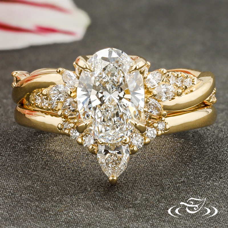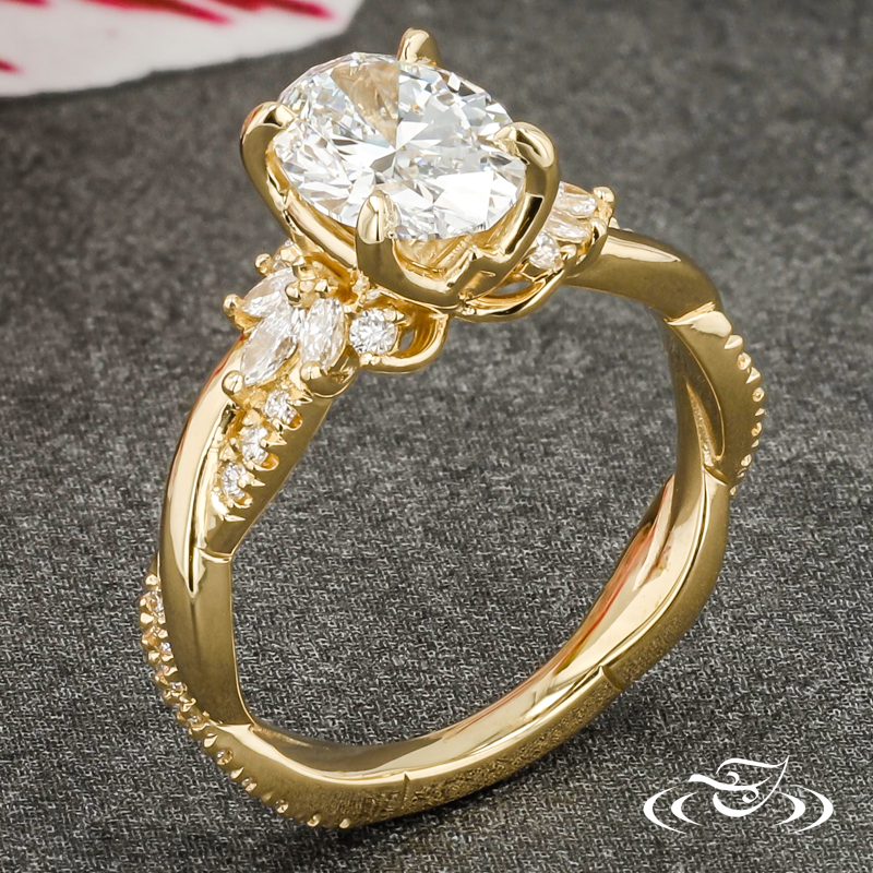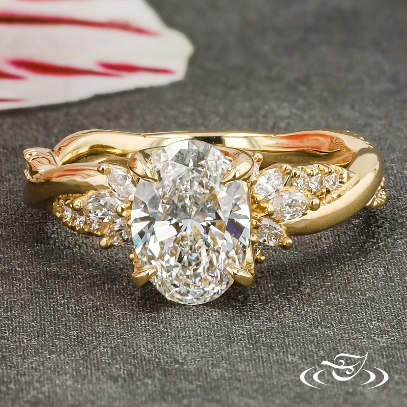 Custom 18kt yellow gold ring featuring (1) 4-prong set GLJW provided oval lab diamond center stone in pierced petal setting. Each shoulder features (3) GLJW provided marquise lab diamond melee and (2) GLJW provided round lab diamond melee, all prong set. Round shank features (2) twists with GLJW provided round lab diamond melee fishtail set on (1) twist. All with high polish finish.