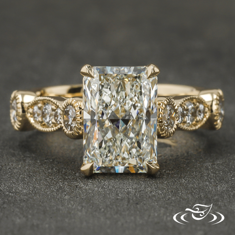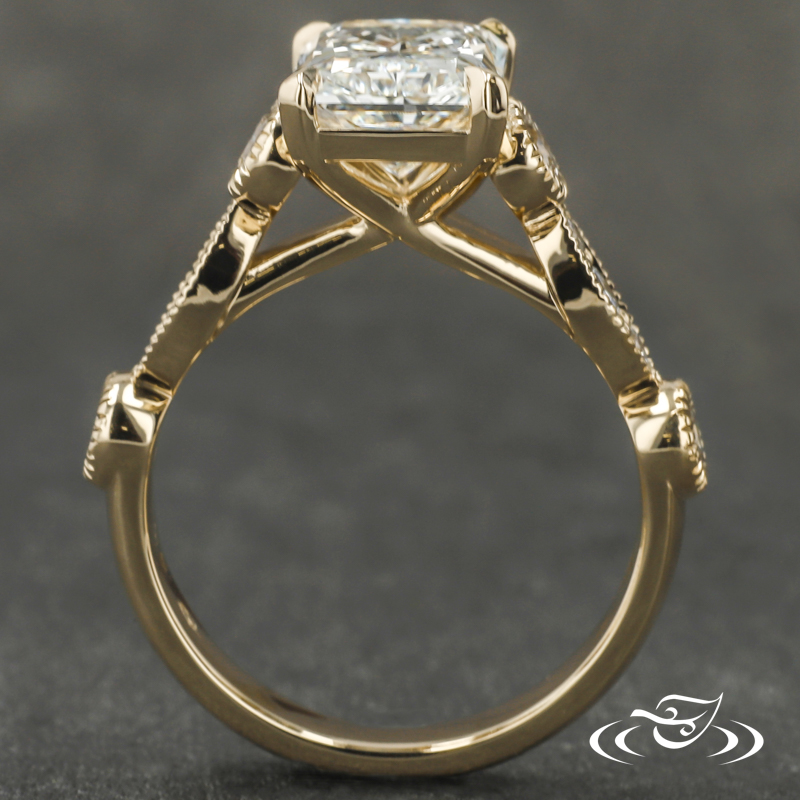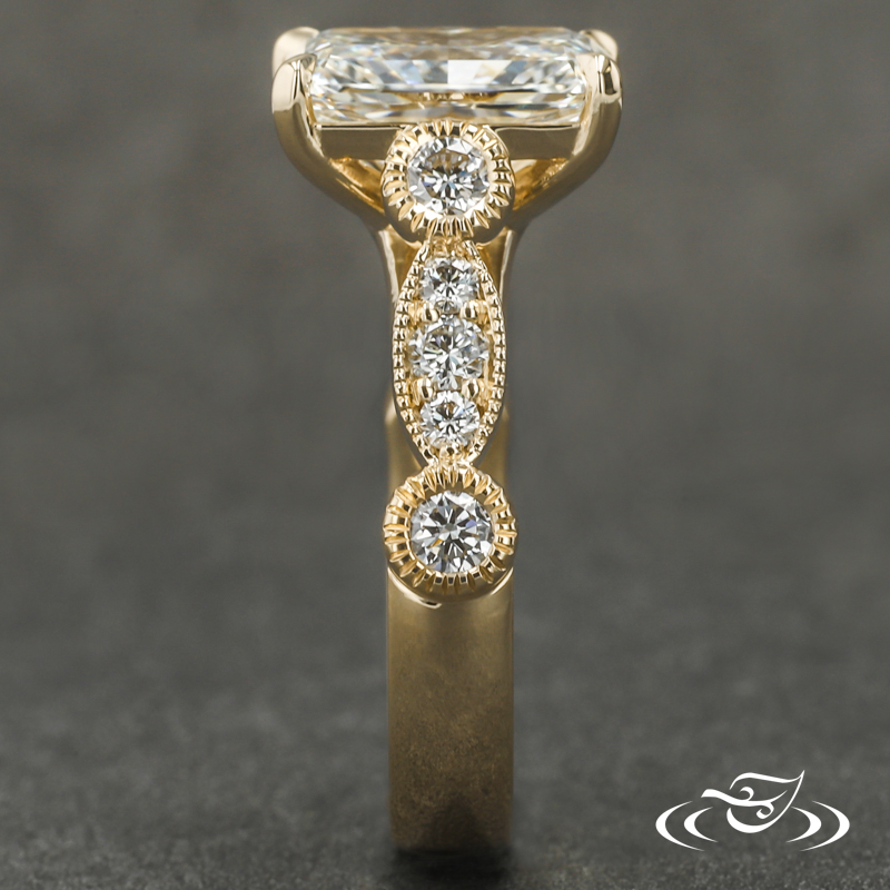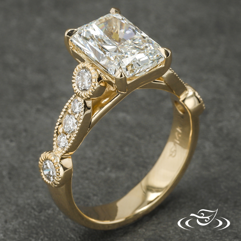 Custom 14kt yellow gold ring holding a 4-prong set GLJW provided round lab diamond center stone with (5) GLJW provided round lab diamonds bead and bezel set on either shoulder highlighted by hand crafted milgrain edges. This ring also has a round shank and a high polish finish.