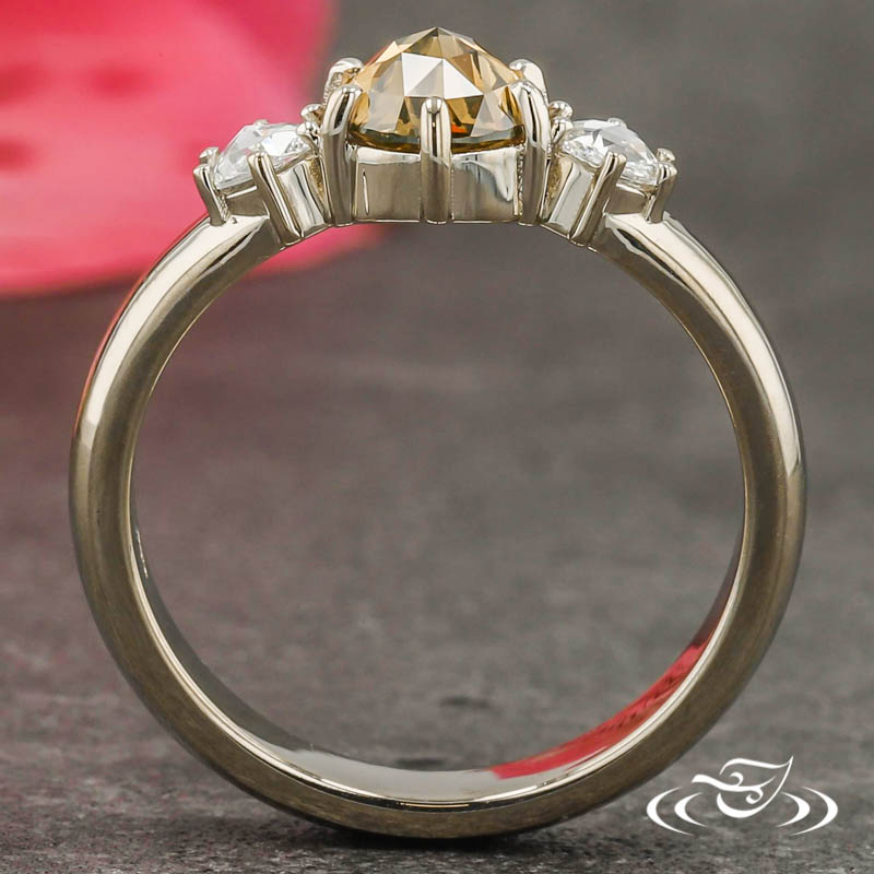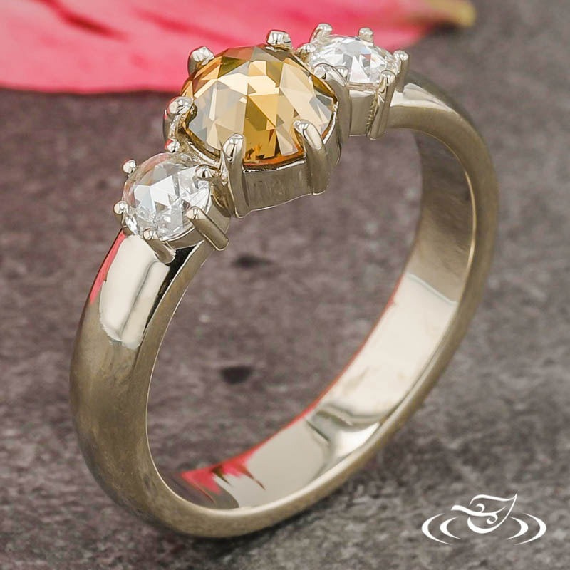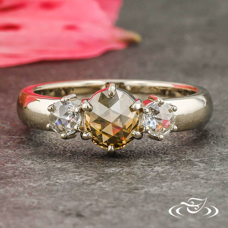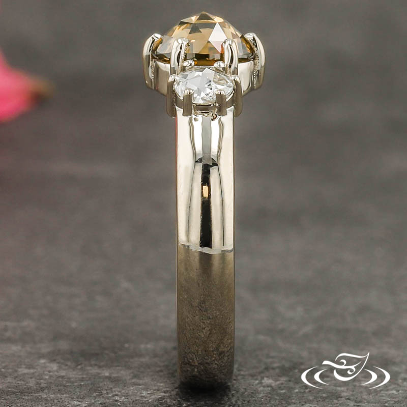 Custom 18kt white gold ring holding a GLJW provided round rustic diamond center stone. This ring also has (2) Rose Cut Diamond side stones a high polish finish.