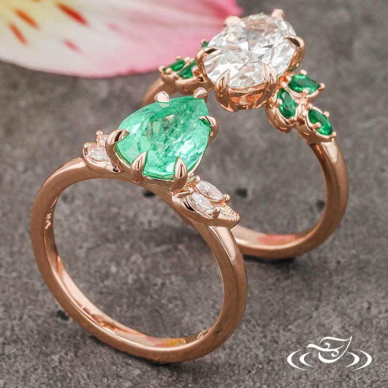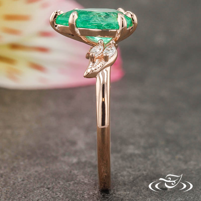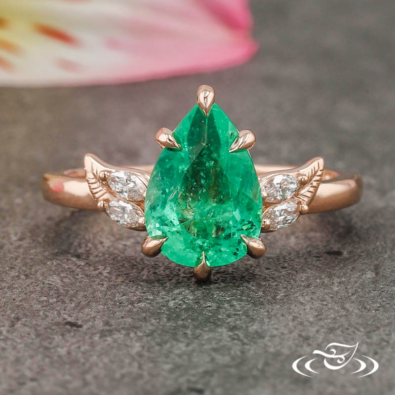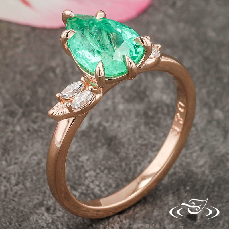 Custom 14kt rose gold ring holding (1) customer provided pear cut emerald center stone 6-prong set with delicate point prongs. Each shoulder holds (2) GLJW provided marquise cut lab diamond melee prong set within a cast-in-place leaf. The tip of the leaves have hand engraved vein detailing. This ring has a round domed shank and a high polish finish.