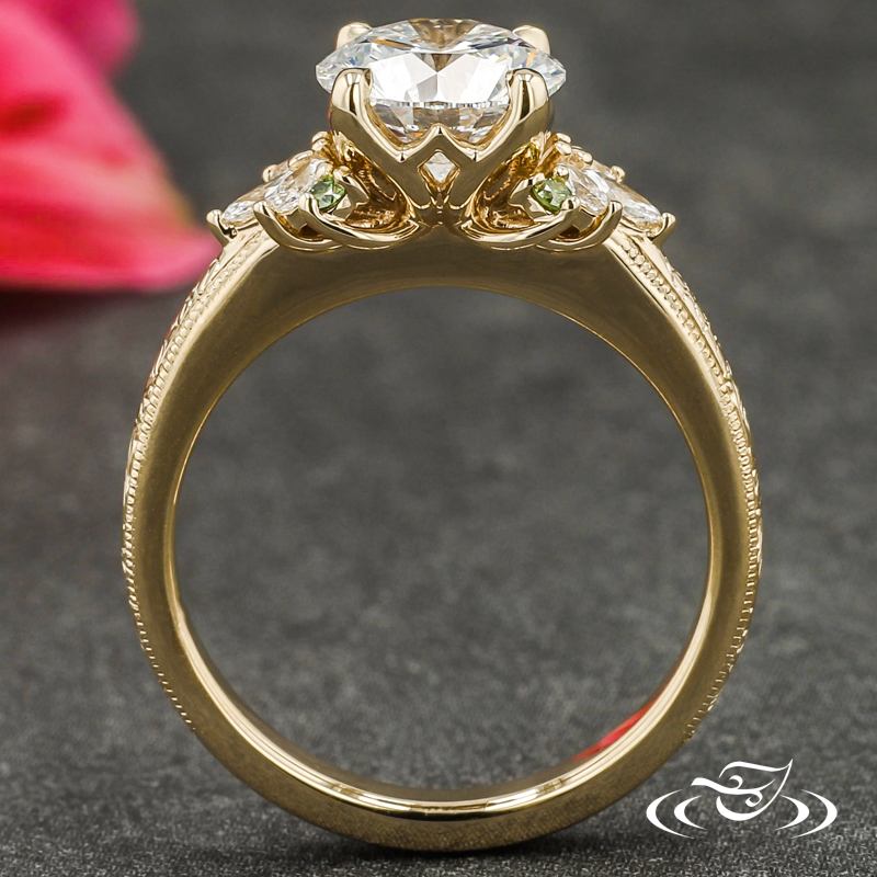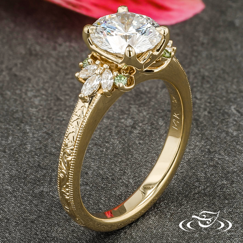 Custom 14kt yellow gold ring featuring (1) 4-prong set customer provided round diamond center stone in pierced decorative setting. Each shoulder features fan of (3) GLJW provided marquise diamond melee with (1) GLJW provided round green diamond melee on each end, all prong set. Round, slightly domed shank features hand engraved Lily of the Valley flowers followed by scroll motifs, all framed with fine milgrain detailing. All with high polish finish.