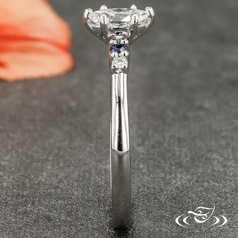 Custom 950 platinum ring featuring (1) customer provided marquise diamond center stone with (2) chevron prongs at ends and (4) pointed prongs at sides. Each shoulder features (1) GLJW provided round dark blue sapphire melee and (1) GLJW provided round colorless diamond melee prong set. This ring also has a round shank, slightly domed profile, and a high polish finish.