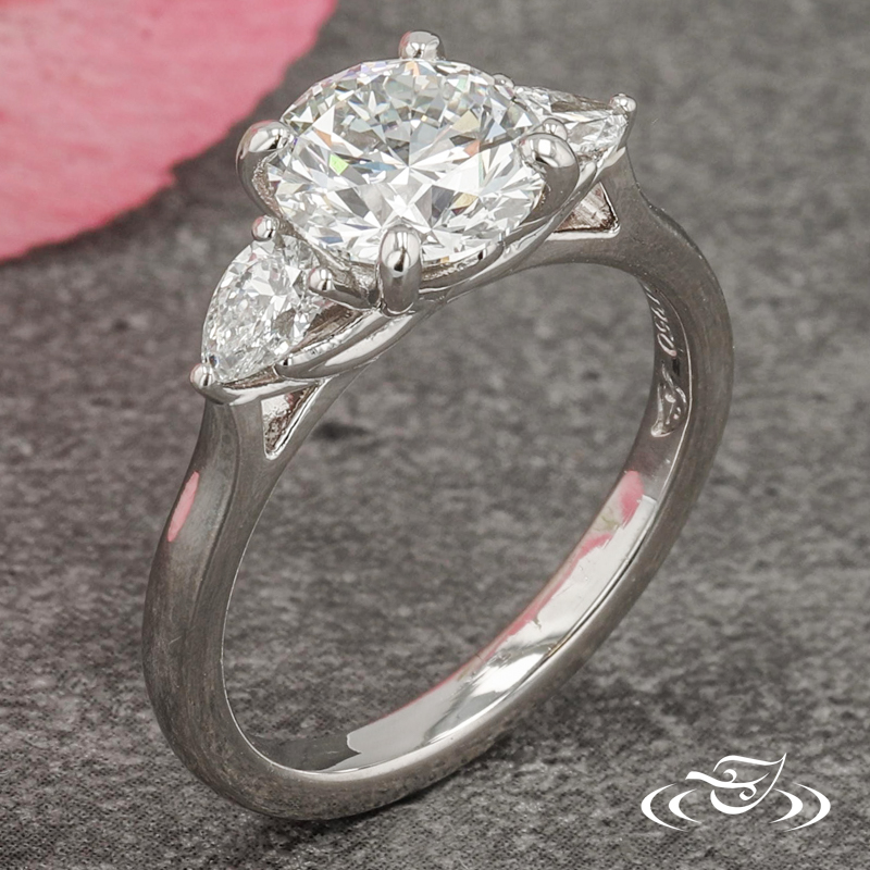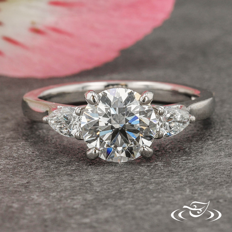 Custom 950 platinum ring holding a 4-prong set GLJW provided round lab diamond center stone. Center stone flanked by (2) prong set GLJW provided pear lab diamond side stones. This ring has a pierced lotus motif on both side faces, a round shank and a high polish finish.