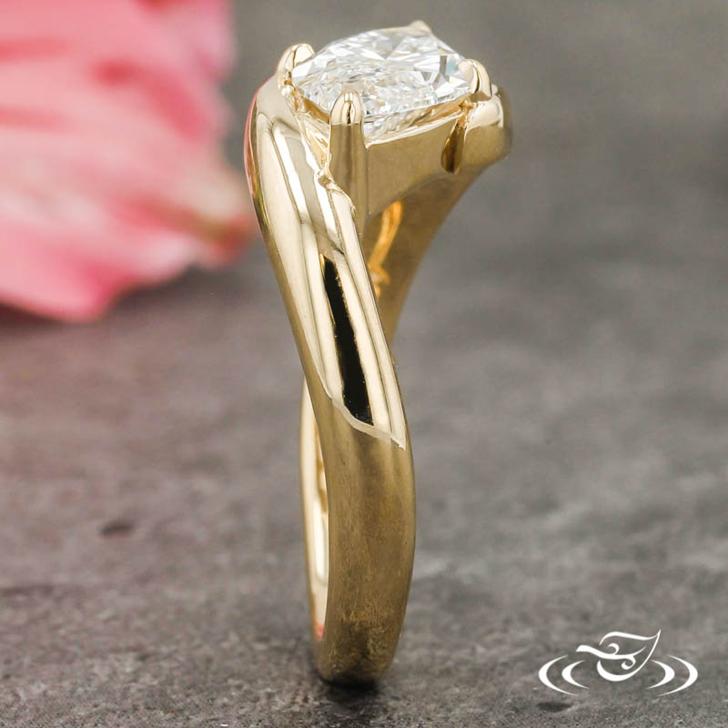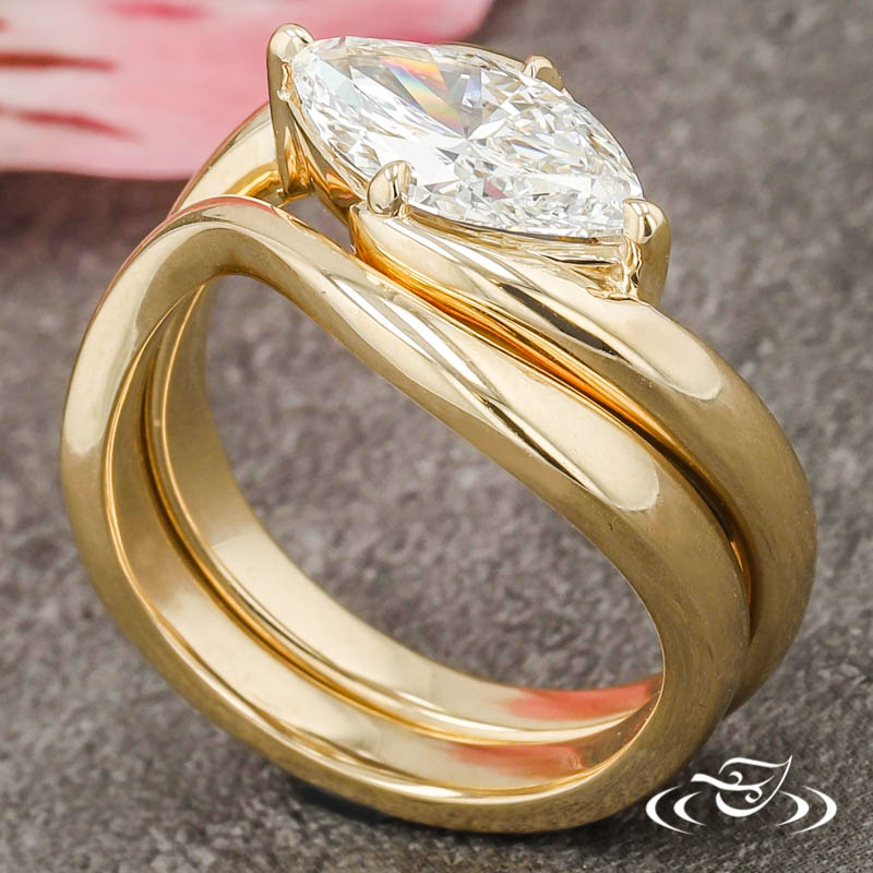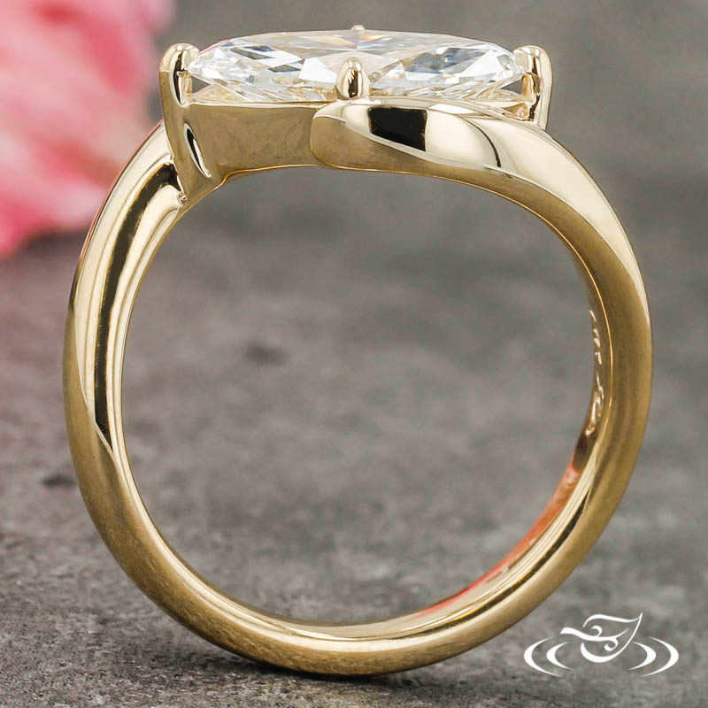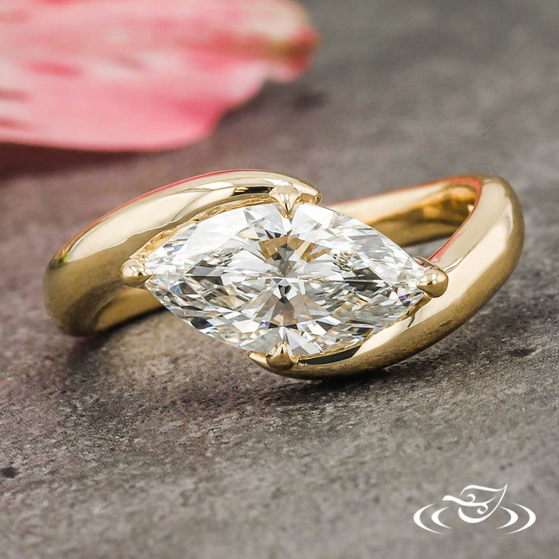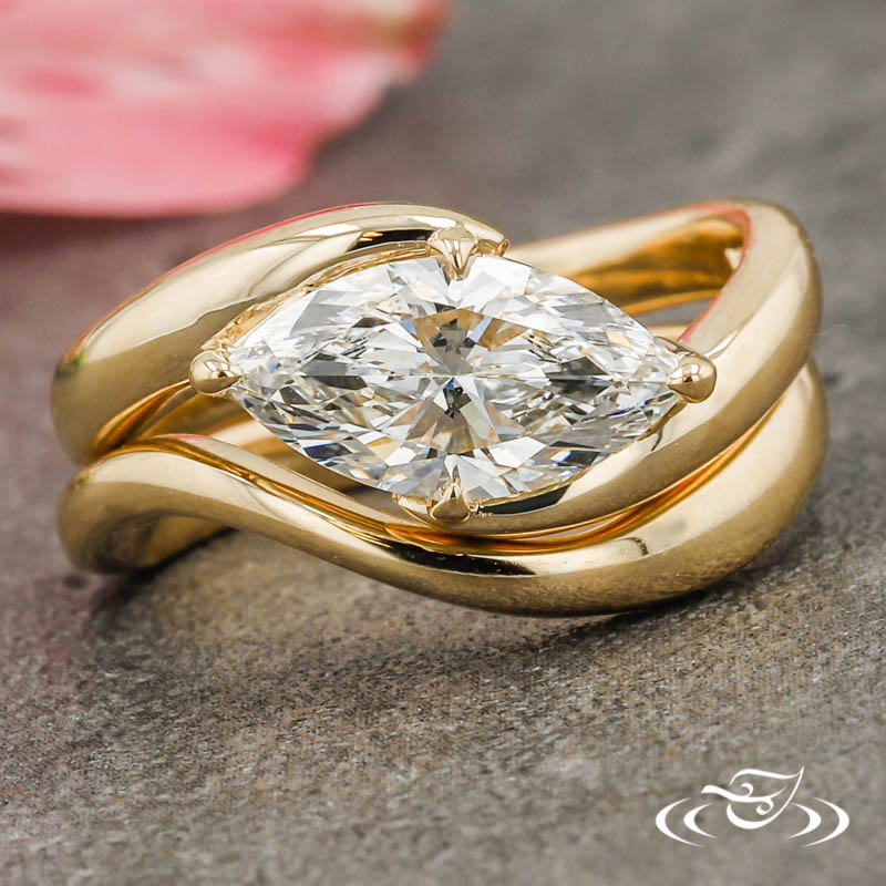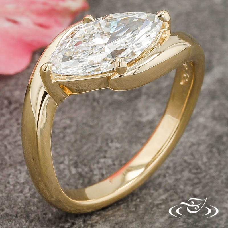 Custom 14kt yellow gold ring holding a GLJW provided marquise lab diamond center stone. This ring also has a shank and a high polish finish.